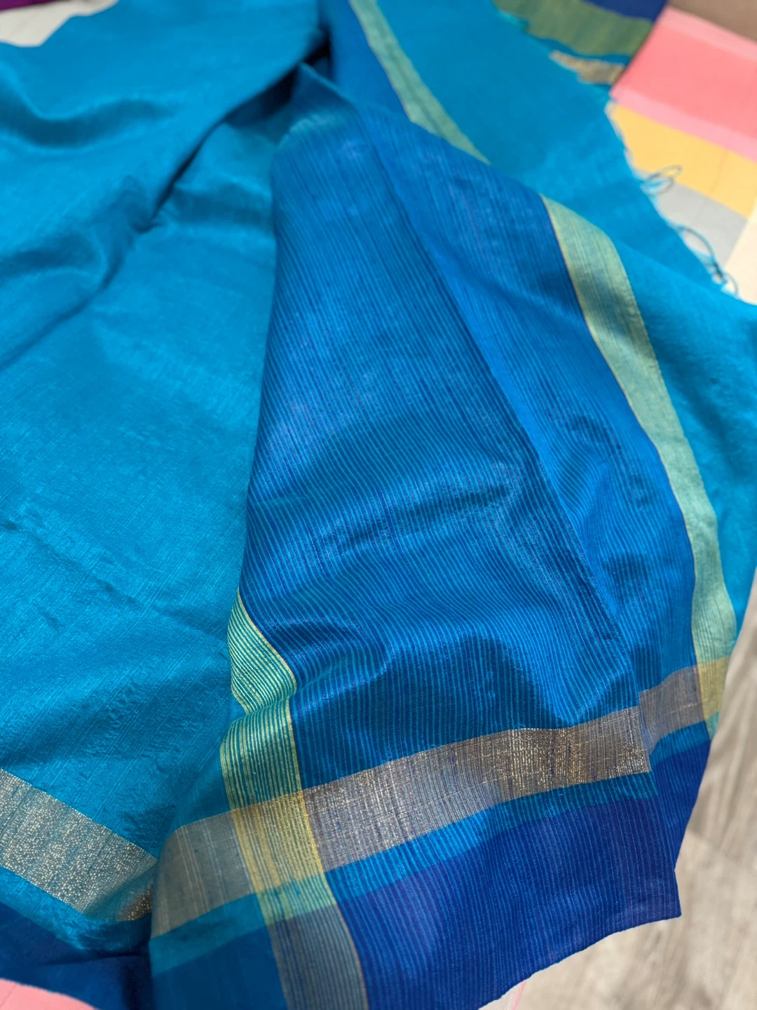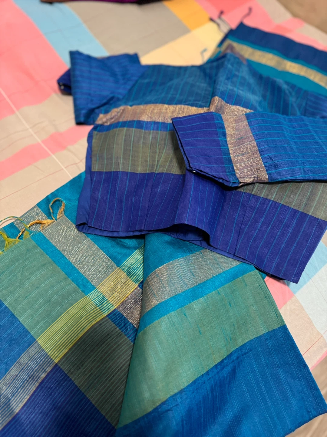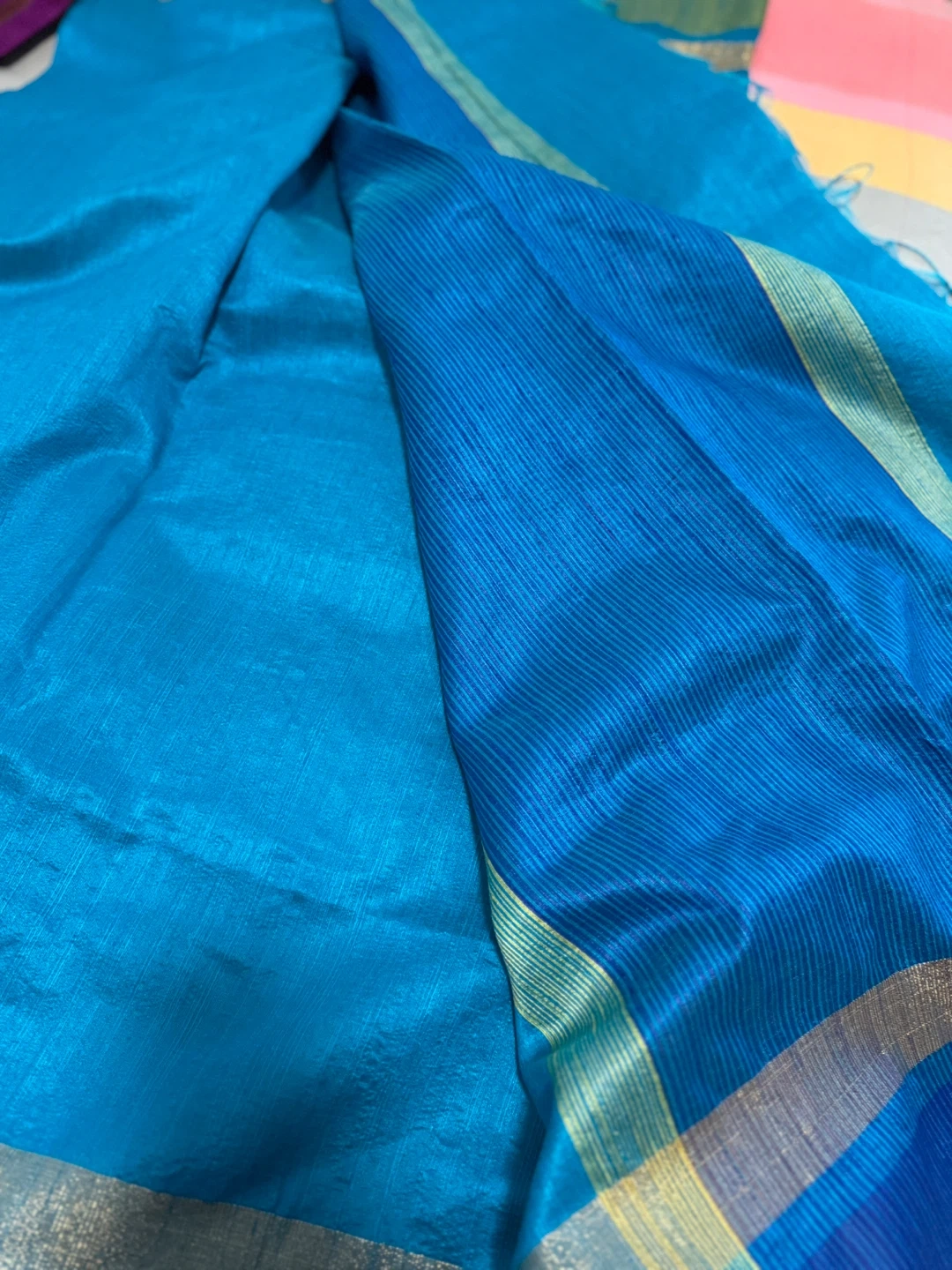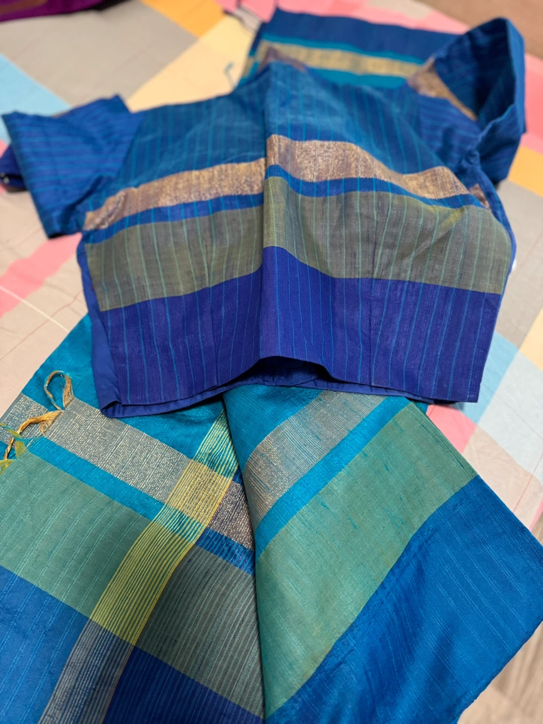 Selling a beautiful blue silk saree. The fabric has a lovely texture and the colours are vibrant. It would be perfect for a special occasion or everyday wear!