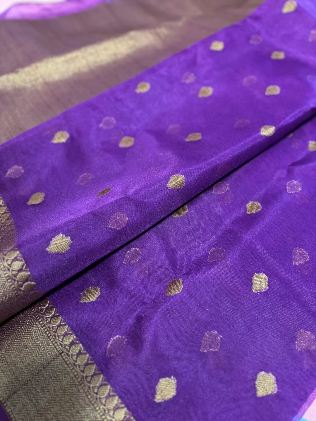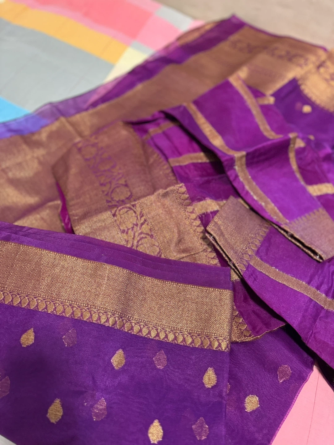 Beautiful purple sari with gold detailing! The fabric feels lightweight and comfortable. Perfect for a special occasion or adding a touch of elegance to your wardrobe