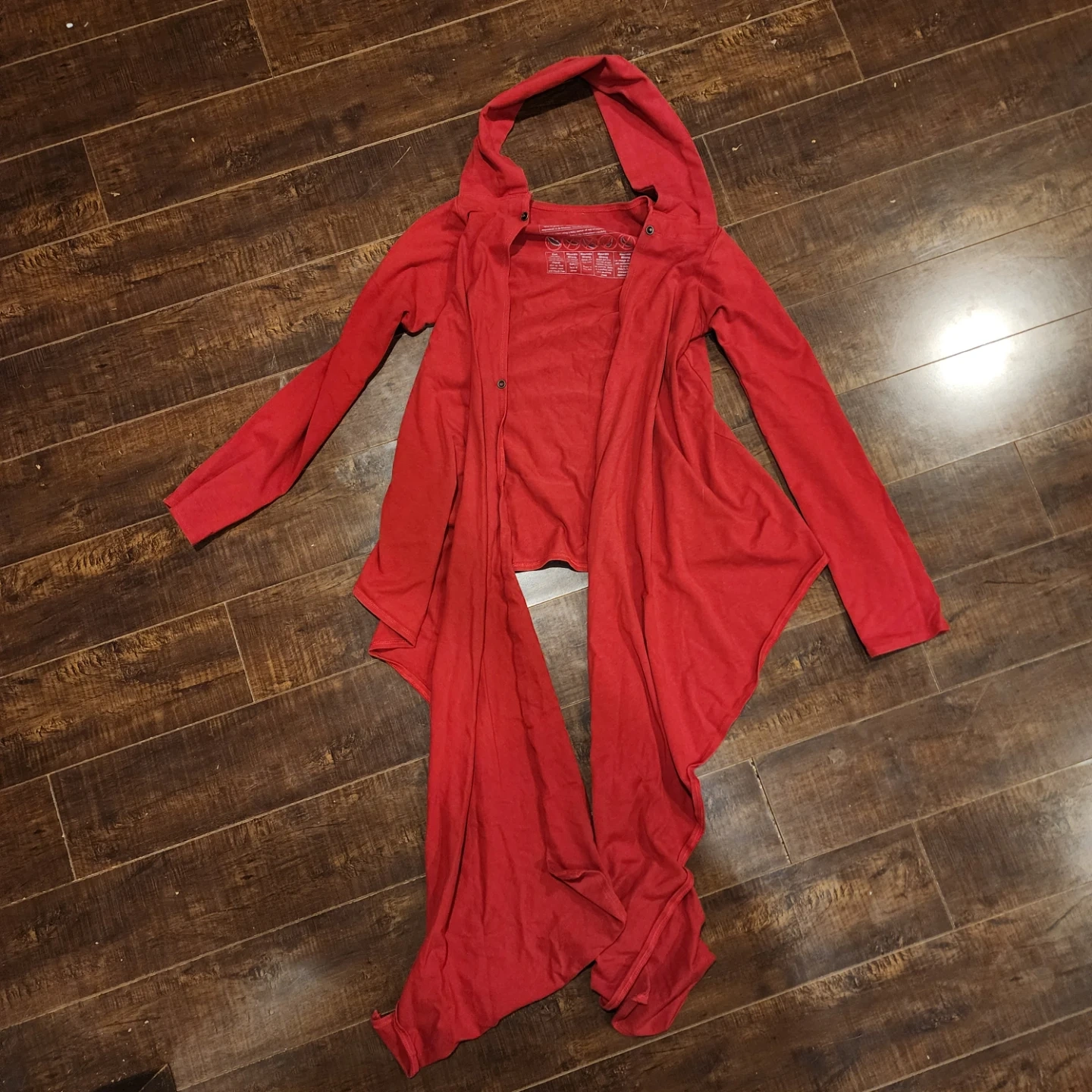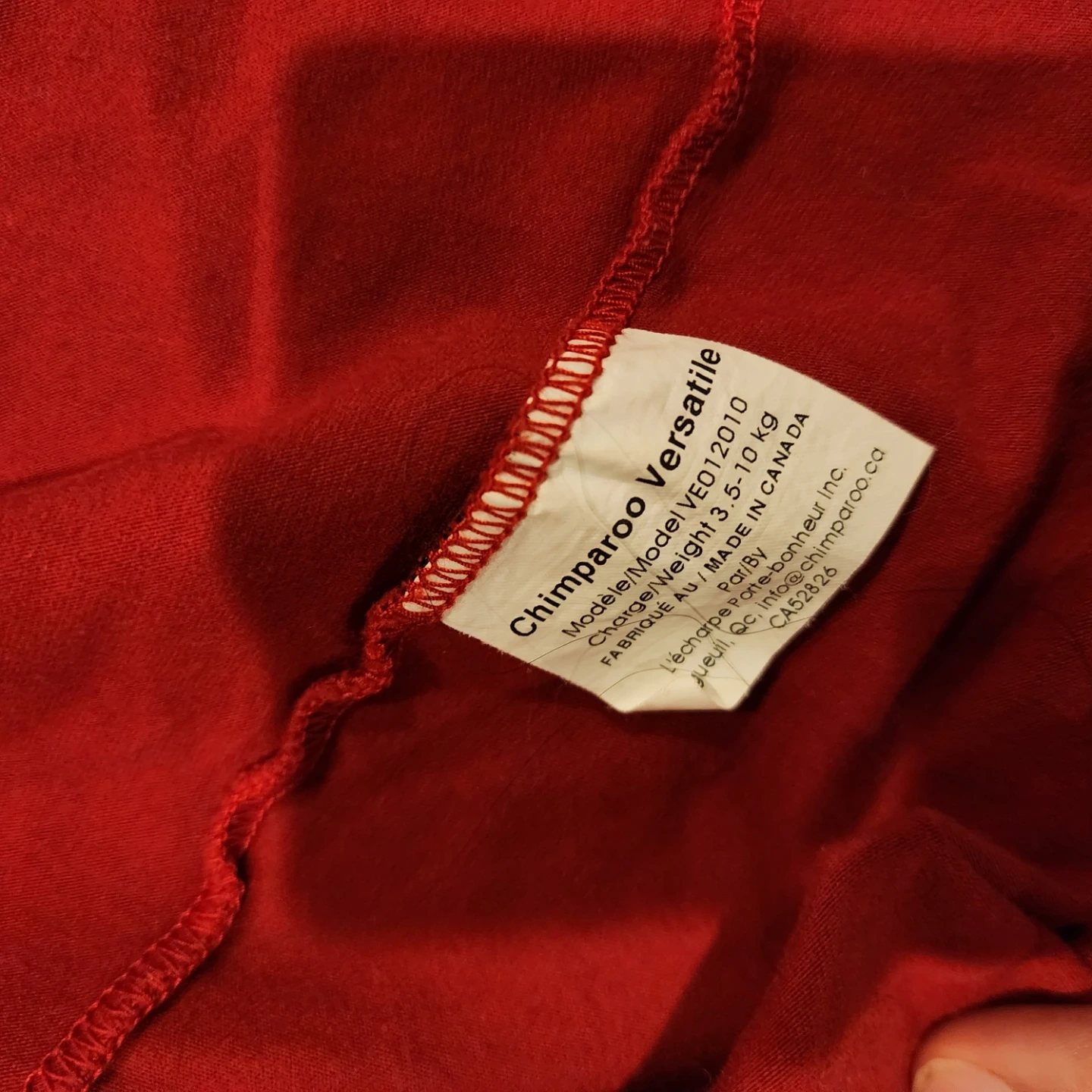 Check out this Chimpäroo Versatile cardigan! It's a vibrant red and perfect for layering. The tag indicates it's suitable for a charge/weight of 3.5-10 kg. Made in Canada