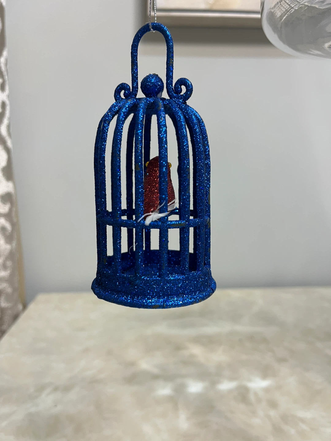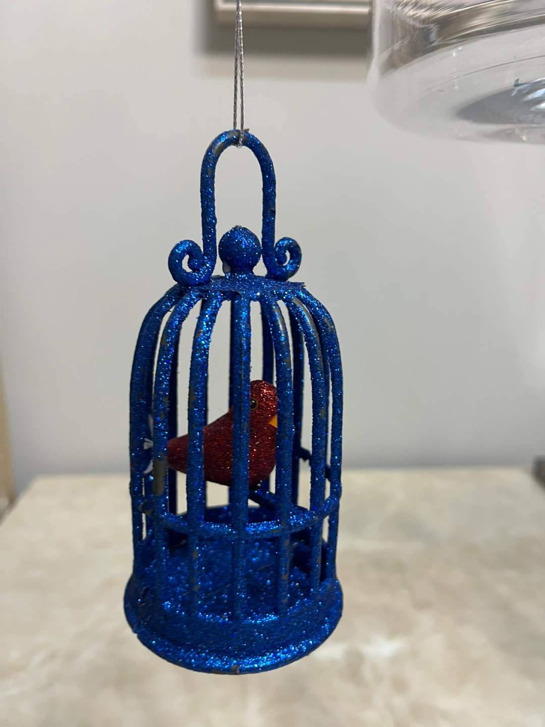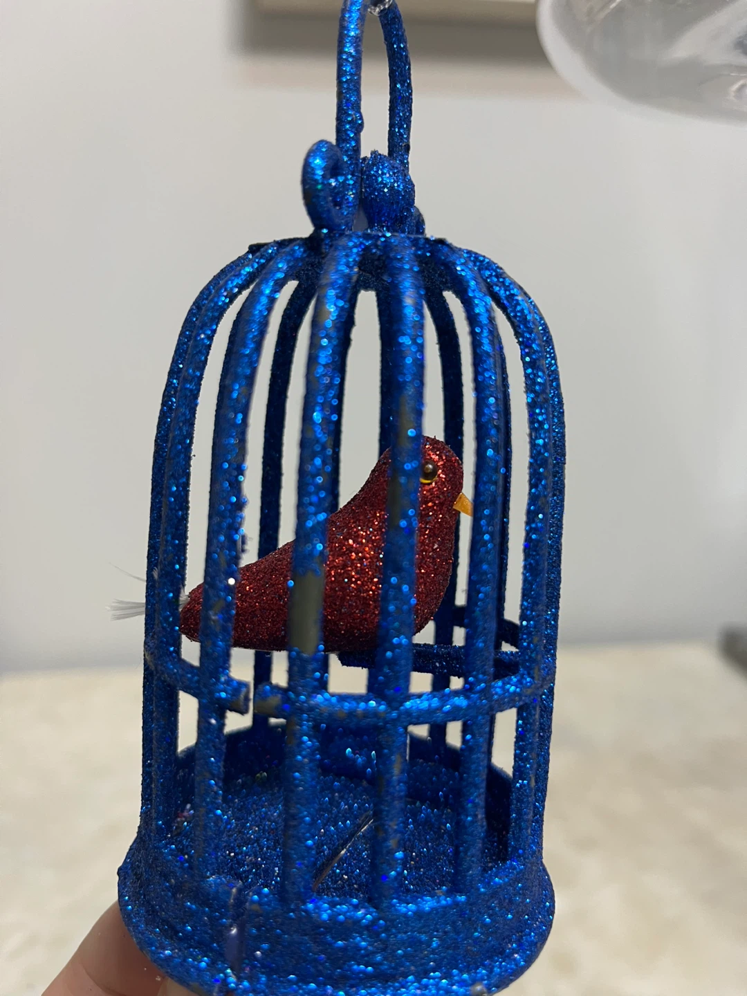 This is a cute blue glitter birdcage ornament with a red bird inside. It's perfect for adding a touch of sparkle to your holiday decor