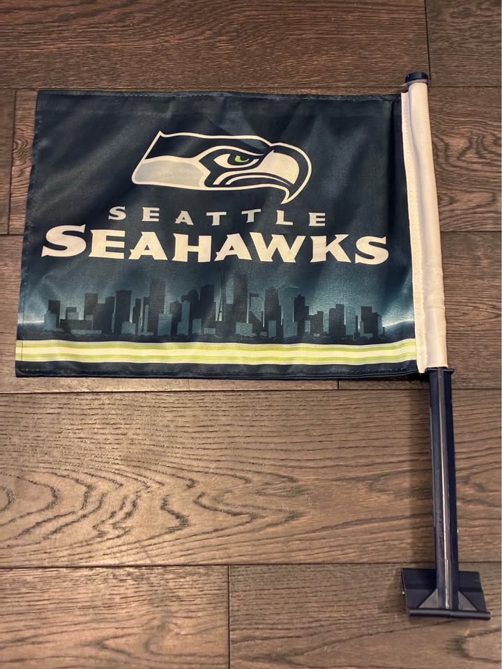 This Seattle Seahawks car flag (double-sided) has been lightly used and is still in decent condition. A great item to show your support for the Pacific Northwest NFL team while driving!