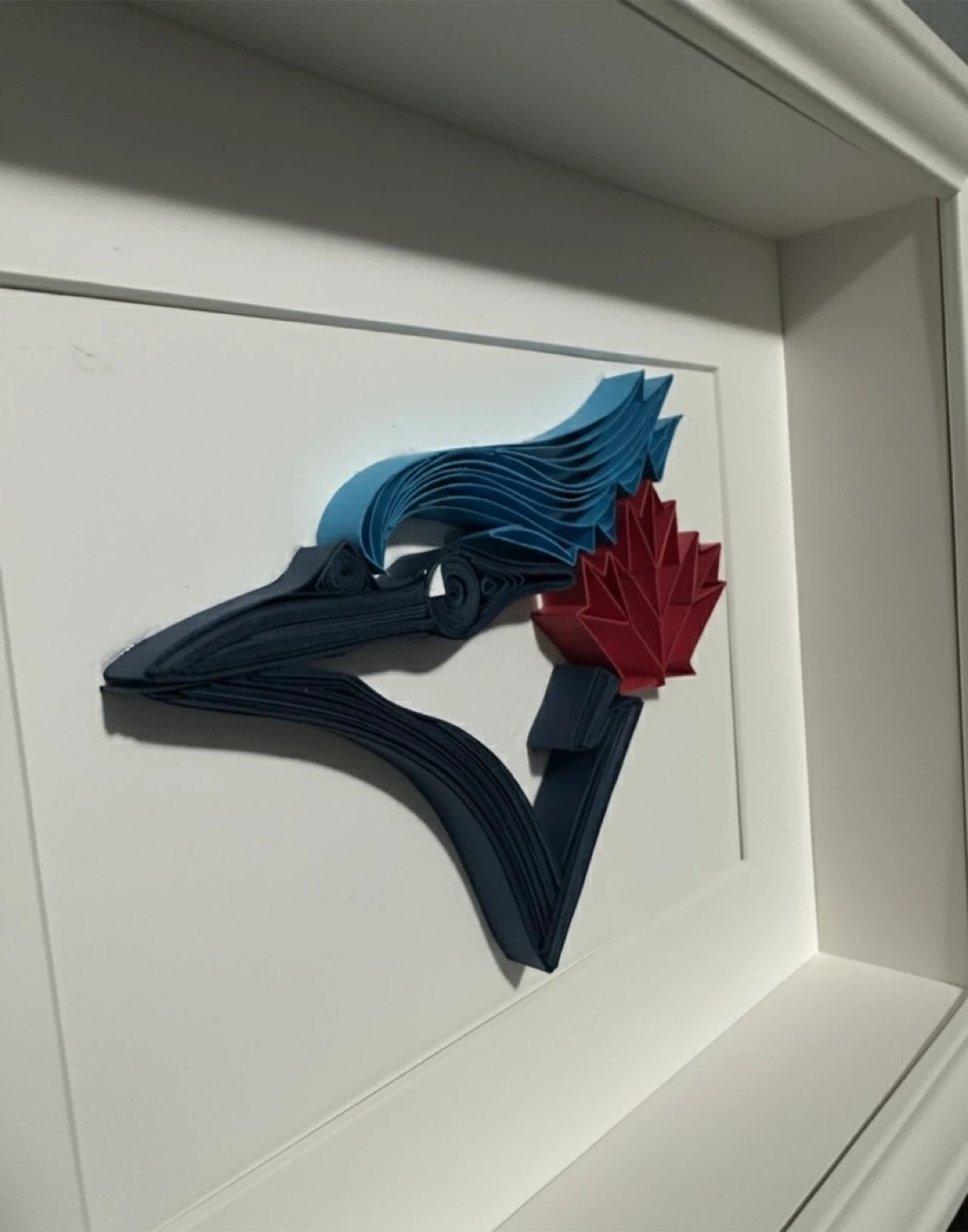 This is a stunning, three-dimensional tribute to the Toronto Blue Jays, meticulously crafted using the art of paper quilling. Every detail of the logo, from the bird's head to the Maple Leaf, is hand-rolled from paper strips, creating unique texture and depth. Framed in a clean, contemporary white shadow box, this unique piece is ready to display and makes an exceptional gift for any devoted baseball fan.