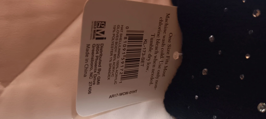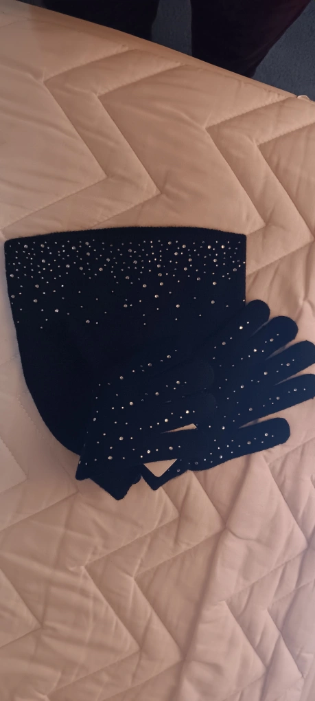It's a one size fits most set, and the hat shell/lining is 100% acrylic. The gloves are 81% acrylic and 19% polyester. The set is black and has some rhinestones, so it's perfect for the fall and winter!