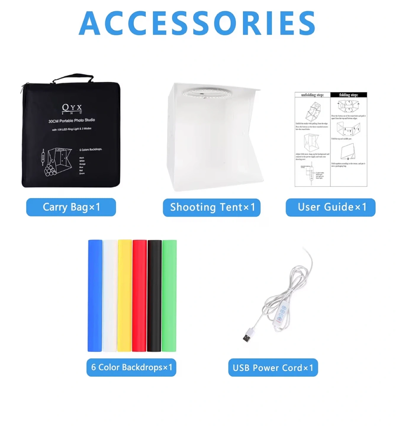 - 6 colour backdrops