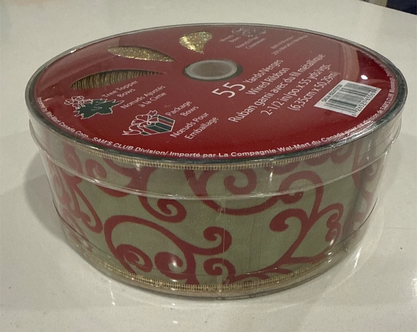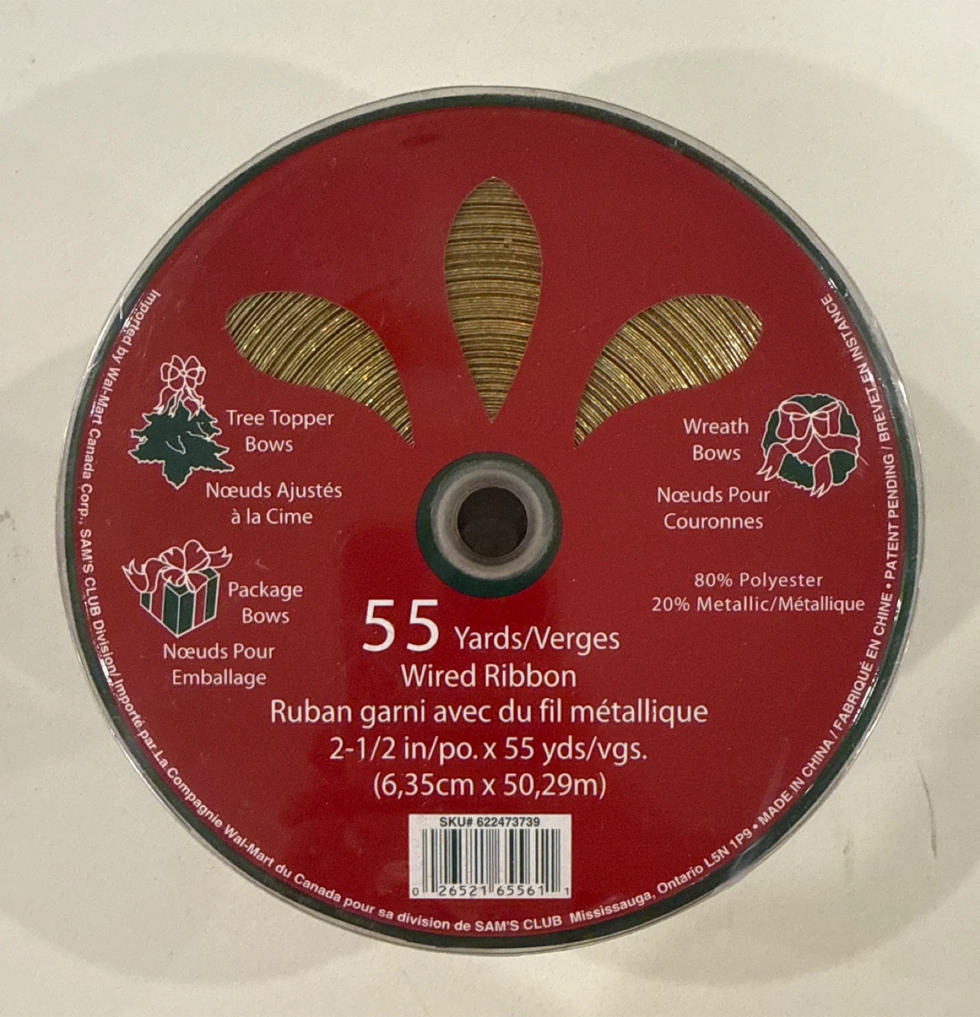 Selling a roll of Sam's Club wired ribbon, perfect for adding a festive touch to your holiday decorations! This ribbon is 2-1/2 inches wide and comes with 55 yards, so you'll have plenty to work with. It's great for tree toppers, package bows, and wreath bows. The ribbon is made of 80% polyester and 20% metallic material, giving it a lovely shimmer.