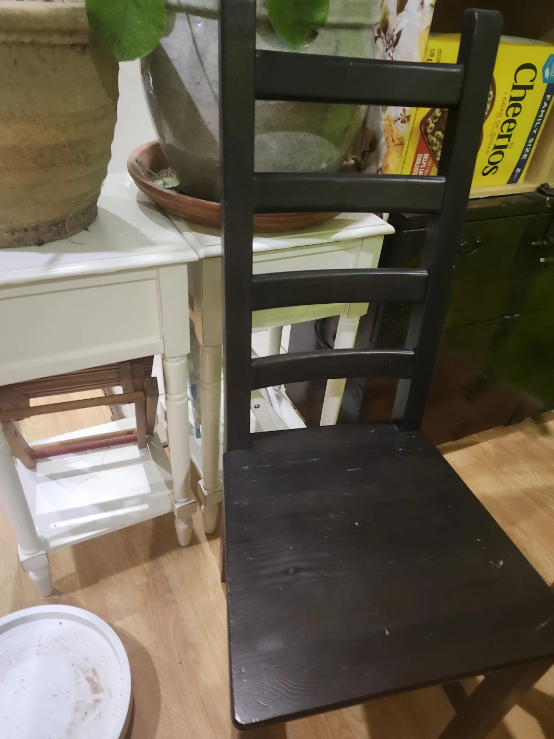 Here's a sturdy black wooden chair with a ladder back design! It's perfect for adding a touch of classic style to your dining area or kitchen. The chair is in good condition and ready to use