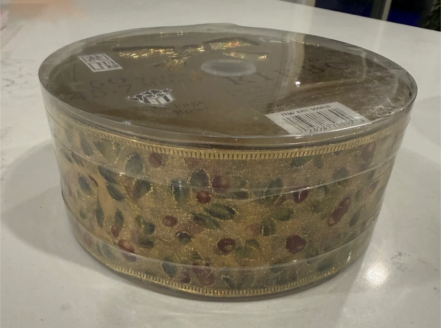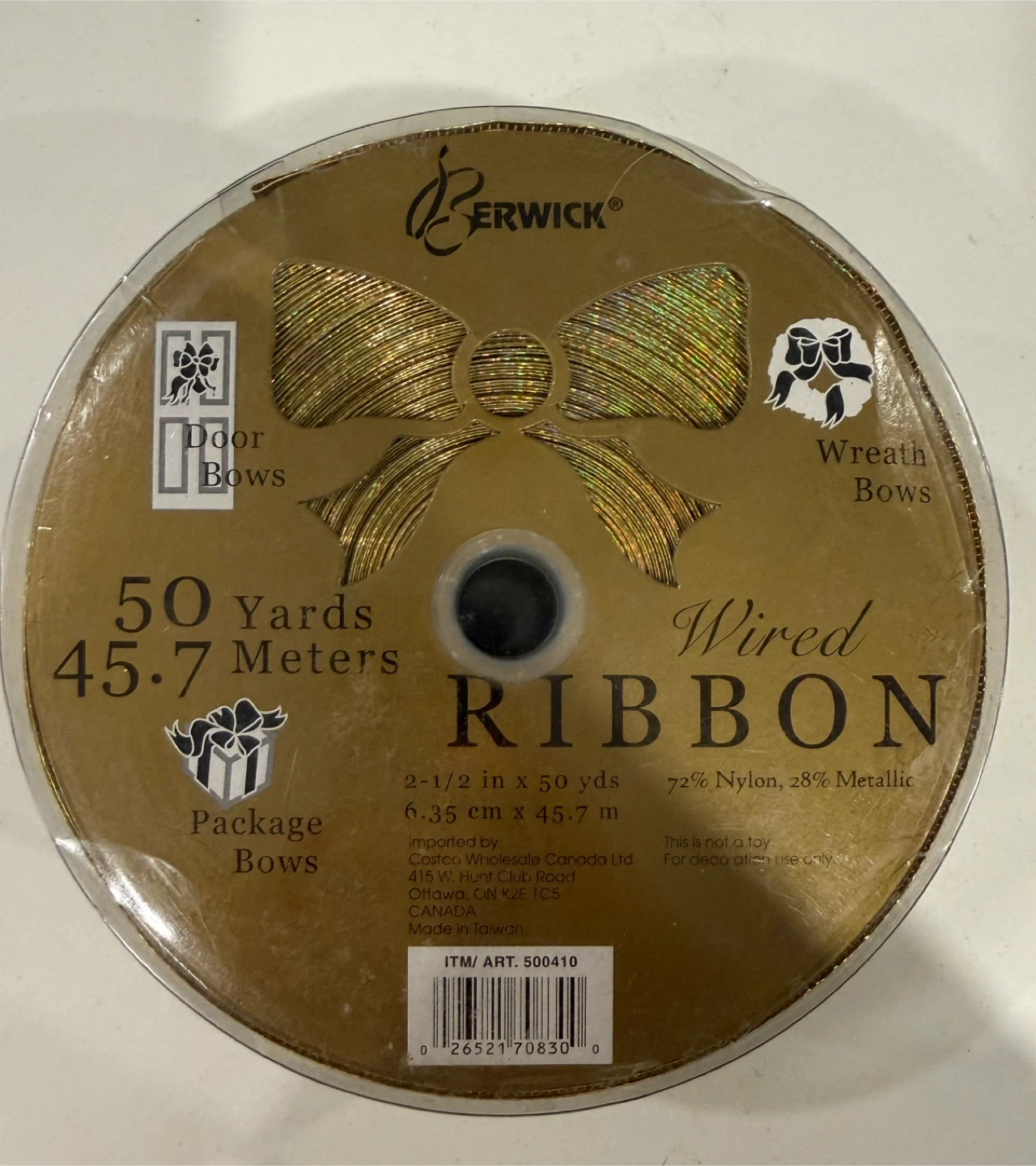 This is a roll of Berwick wired ribbon, perfect for door bows, wreath bows, and package bows! It's 50 yards (45.7 meters) long and 2-1/2 inches wide. The ribbon is made of 72% nylon and 28% metallic material