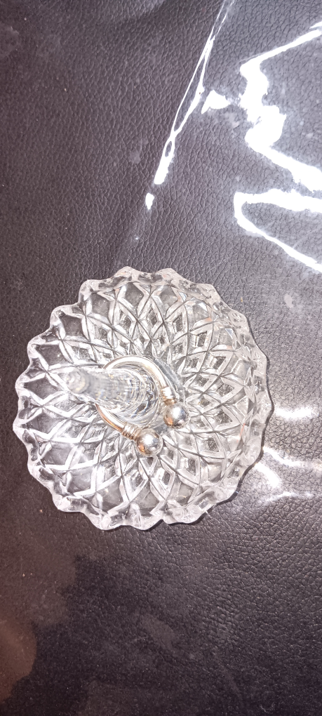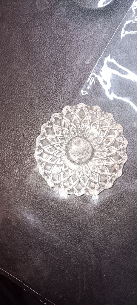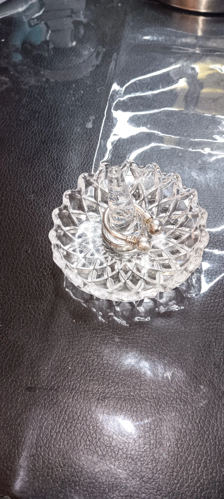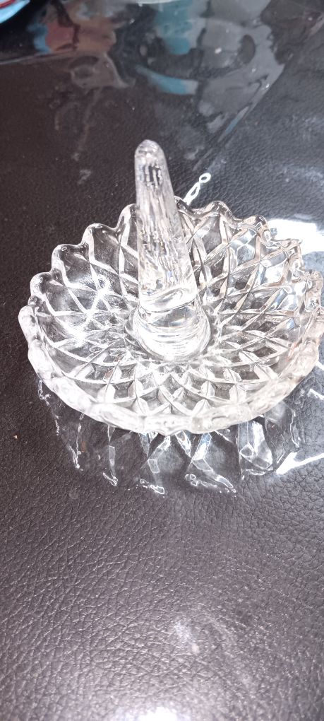 Selling a crystal ring holder dish. It's in great condition and perfect for organizing your rings or other small jewelry items. The dish has a beautiful, intricate design. It measures about 3 inches in diameter.