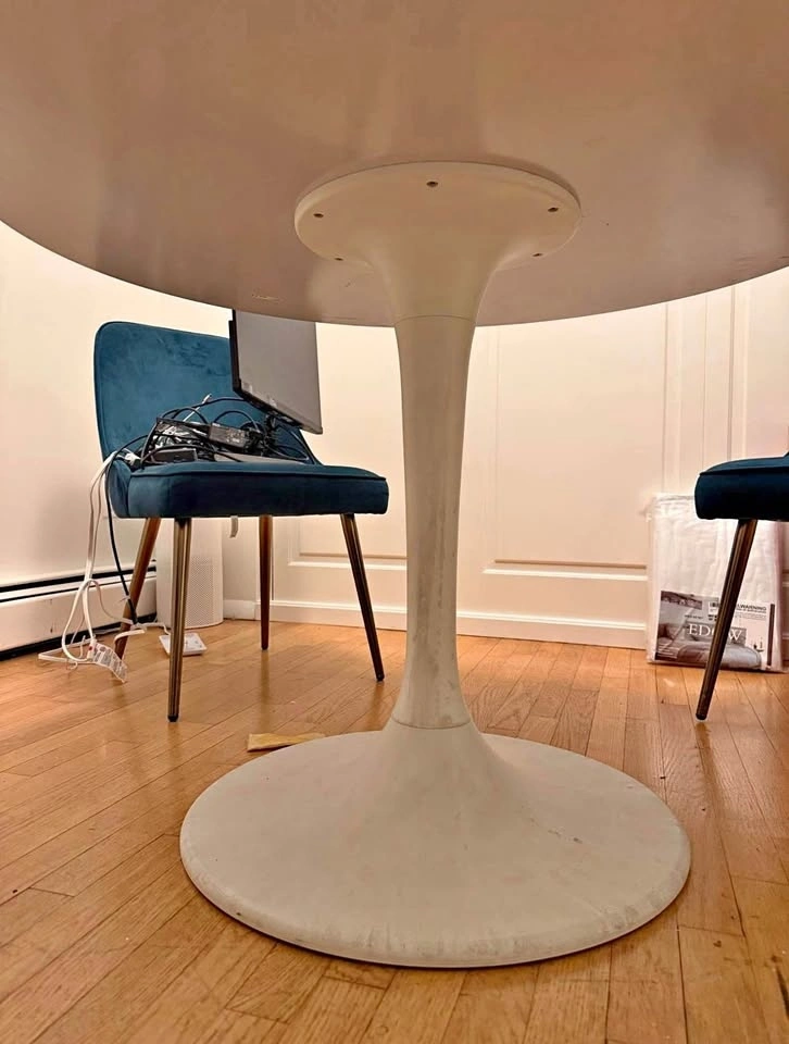 Modern Round Pedestal Dining Table that Seats 3–4 people comfortably.