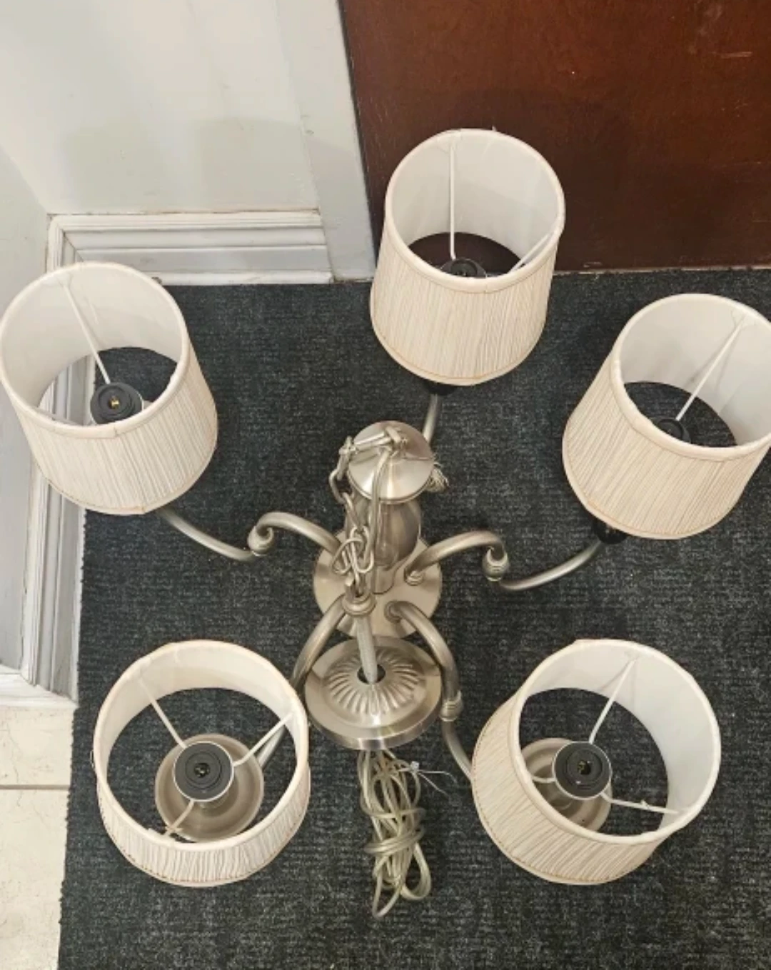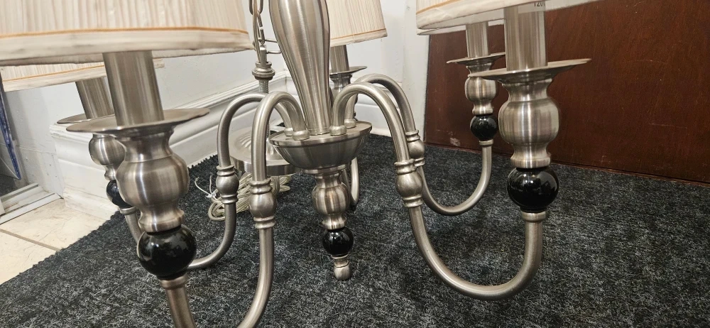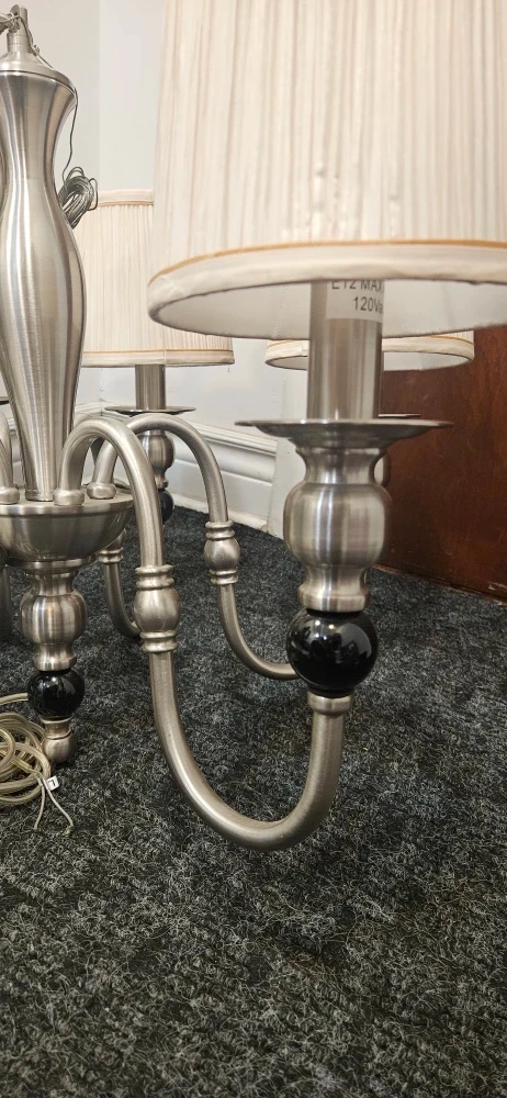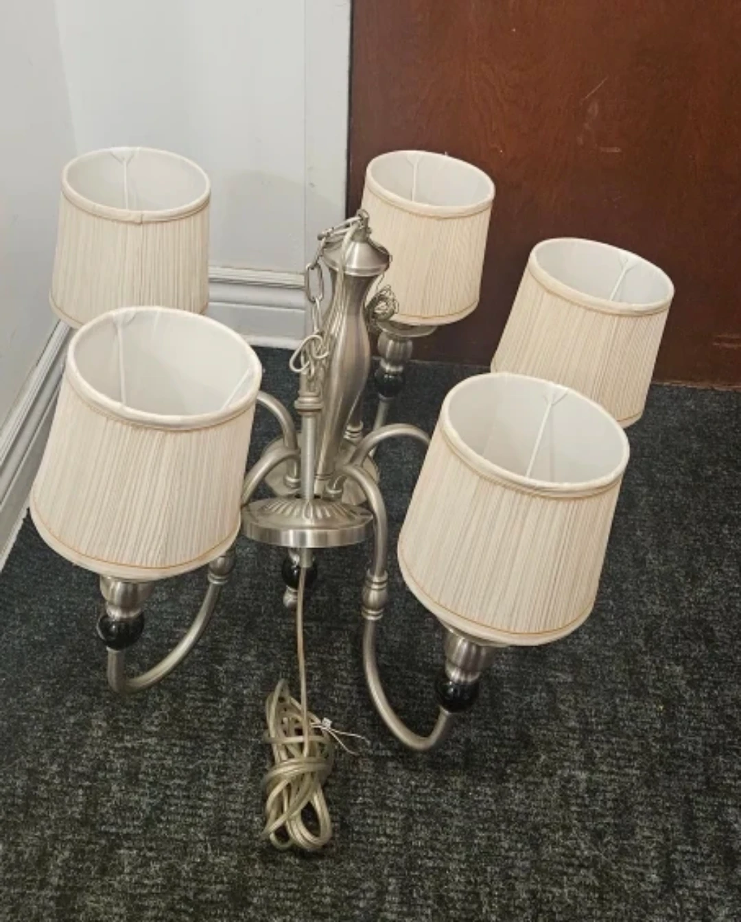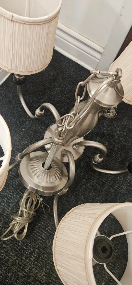Selling a chandelier with five lights and fabric shades. The metal is a brushed silver colour and the shades are off-white. It's in good condition and ready to brighten up your space!