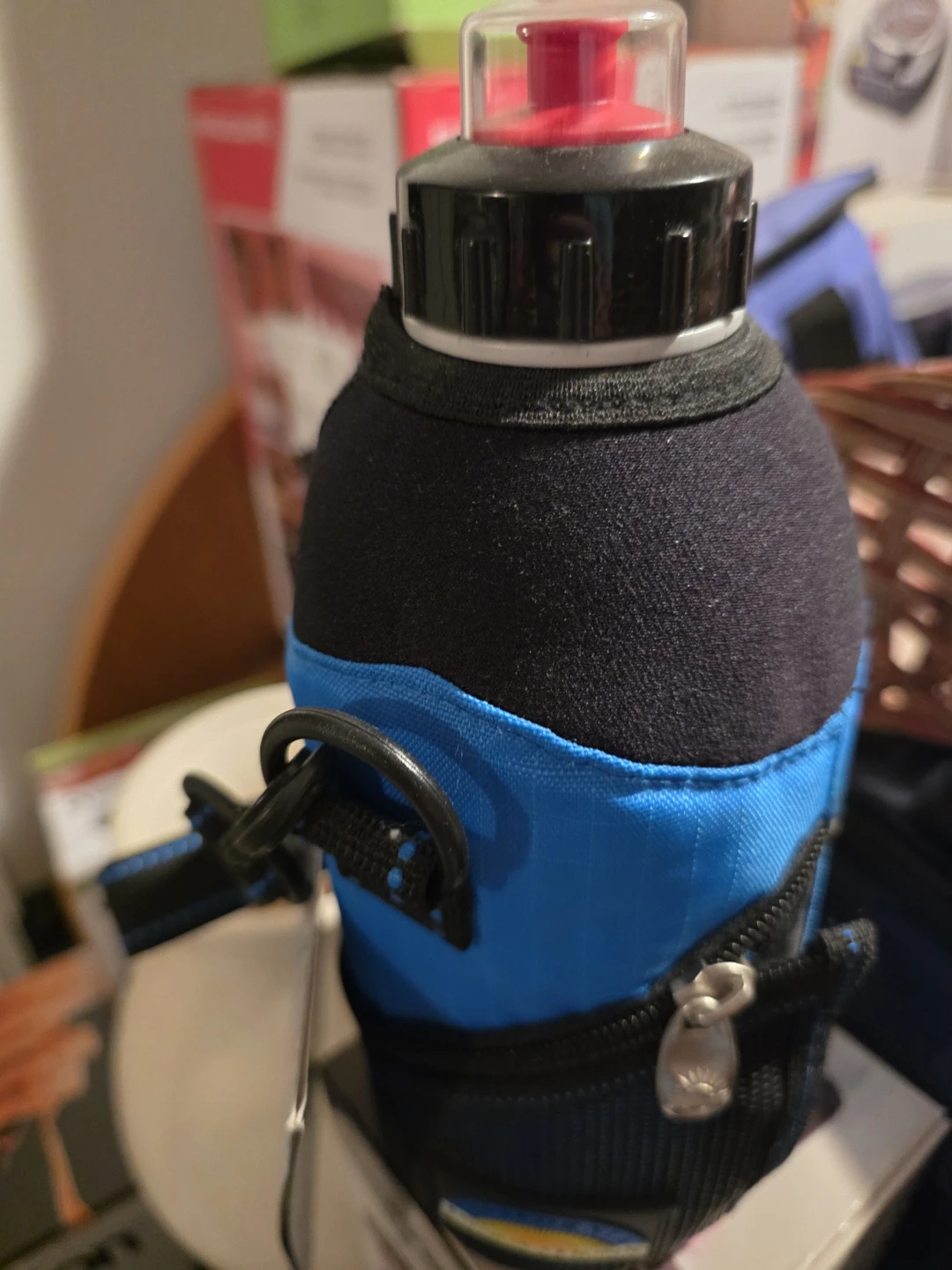 Here's a handy insulated water bottle carrier in blue and black! It looks like it has a zipper pouch for small items too. Perfect for keeping your drink cool on the go!