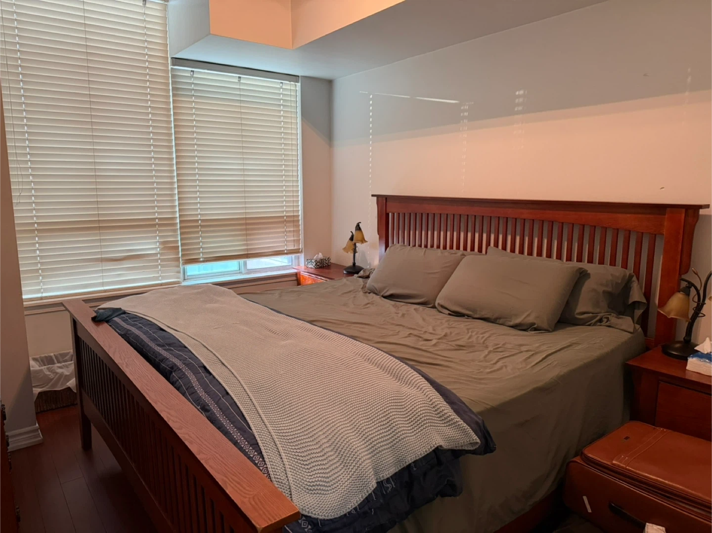 Kingsized Bedroom set includes a dresser with a mirror and a nightstands . The set is made of wood and has a reddish-brown finish. It's in good condition with visible scratches. Mattress included.