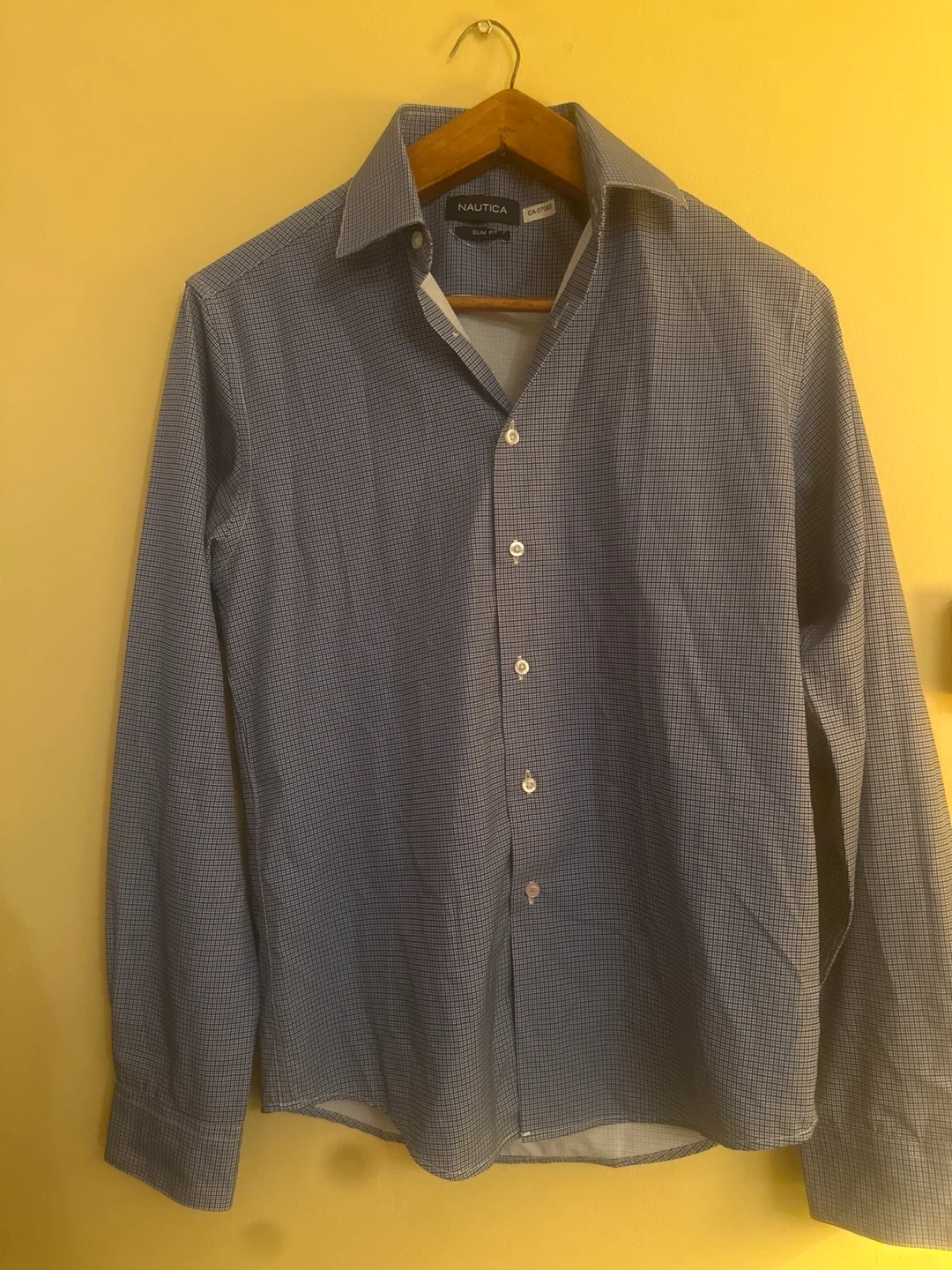 Selling a new Nautica shirt in size small It features a slim fit an a subtle blue checkered pattern. Perfect for business casual or a night out!
