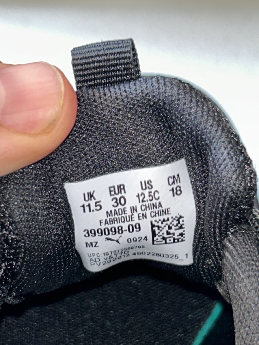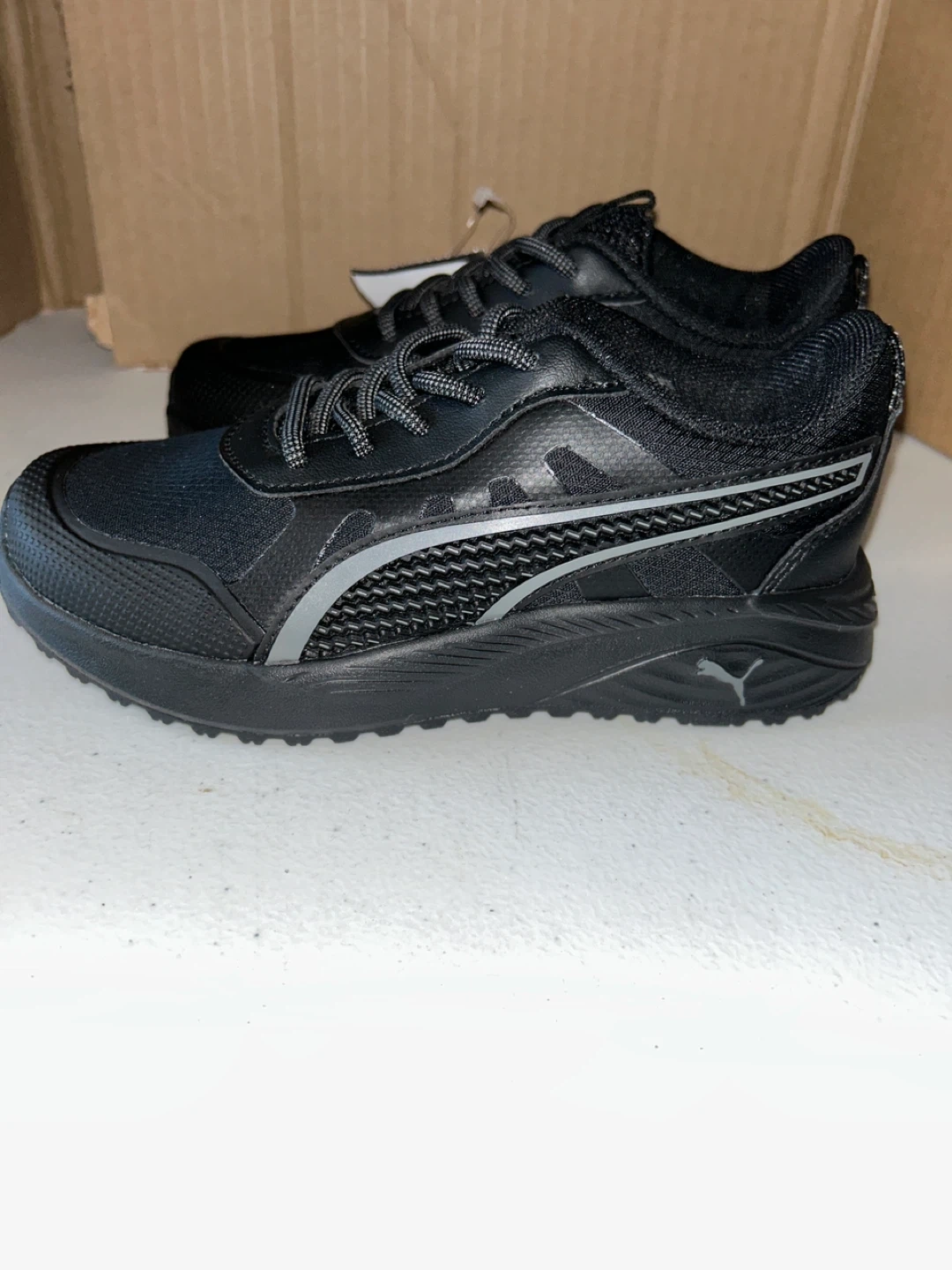 These are a pair of Puma running shoes in black. They are size US 12.5C. Great for kids!
