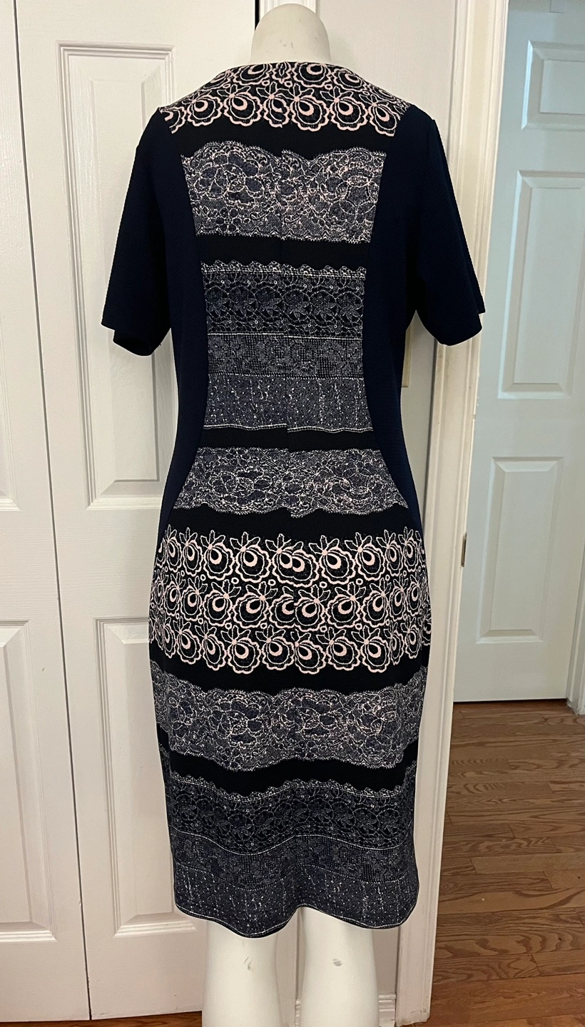 Here's a Cyreos Clothing dress in size large! The dress is navy blue with a unique pattern., stretchy material .It's in great condition and ready for a new wardrobe!