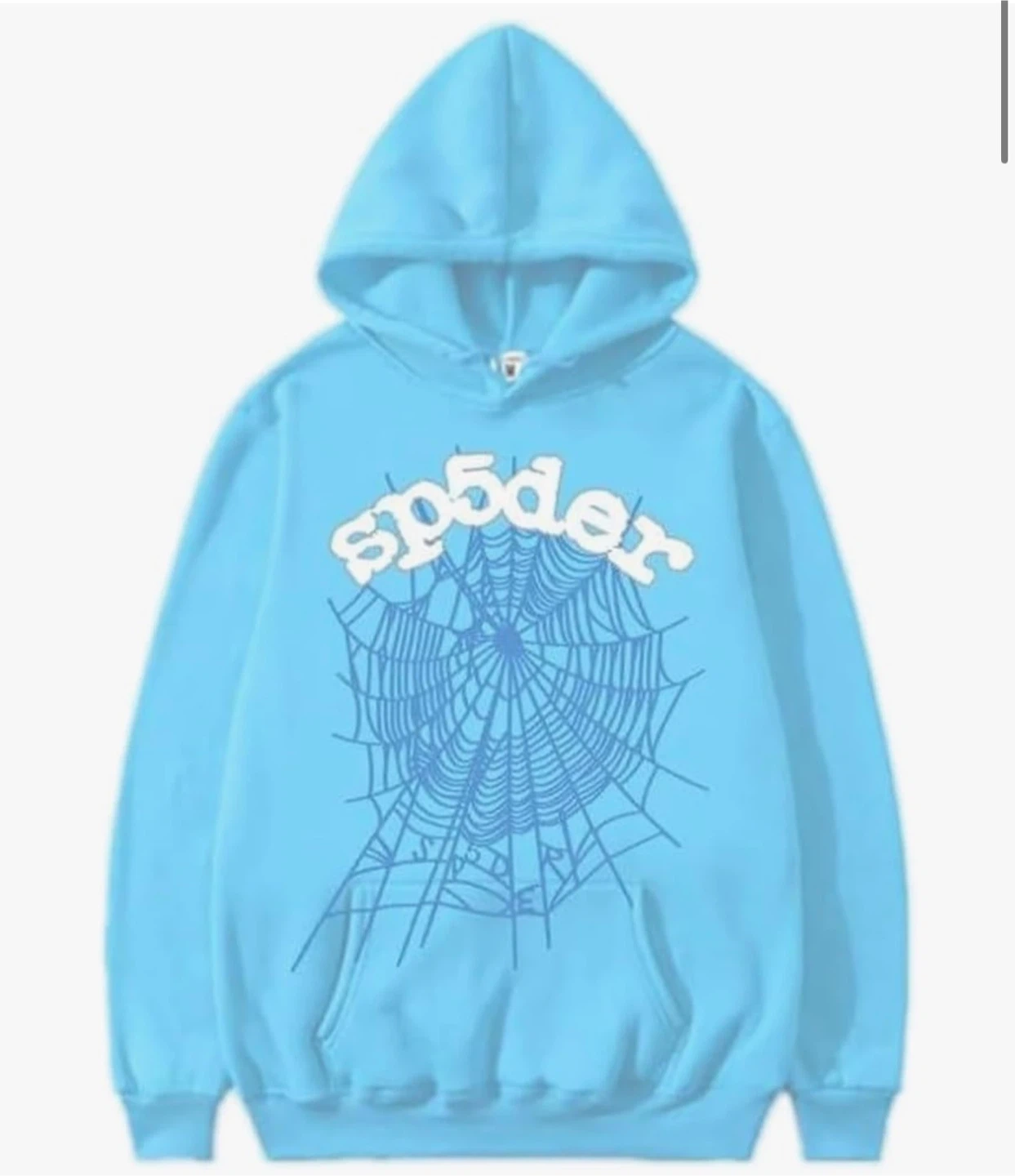 Selling a blue Sp5der hoodie. The hoodie features a spiderweb design on the front. The size chart has a bust of 42.52 inches, a shoulder width of 18.5 inches, a sleeve length of 24.41 inches, and a length of 27.95 inches