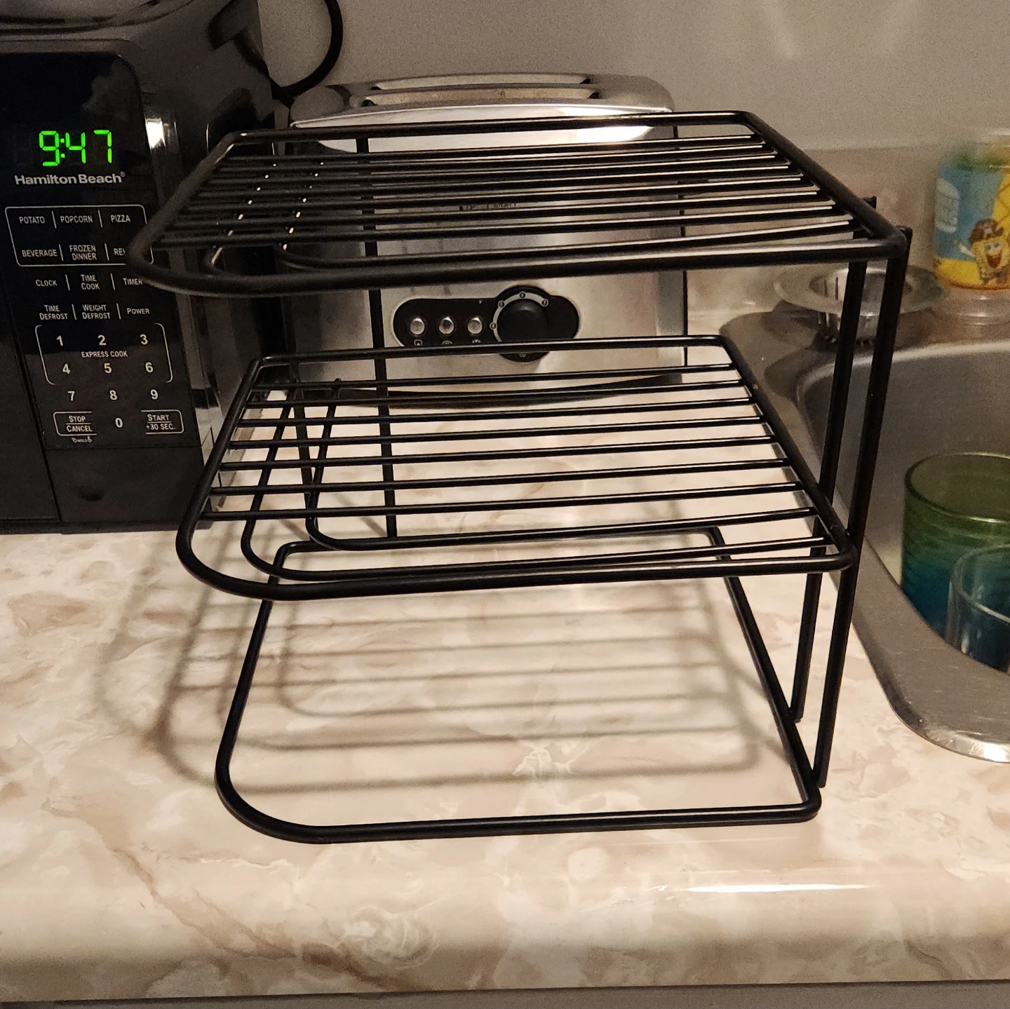 A black metal cupboard organizer. It's pretty heavy duty Wright wise. Good for organising plates and bowls.