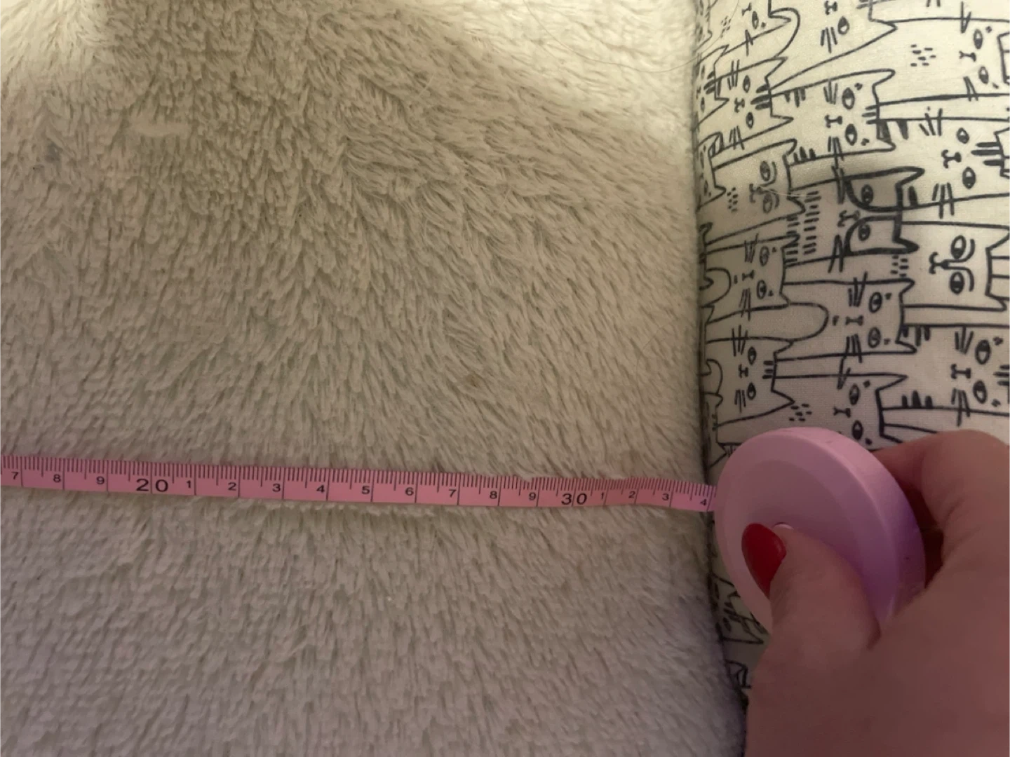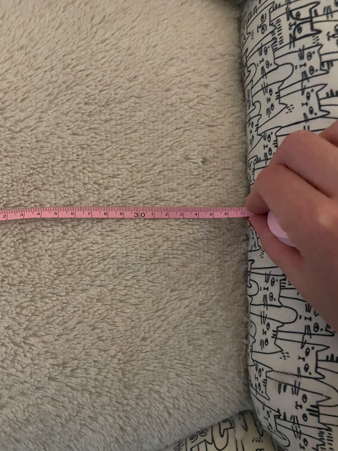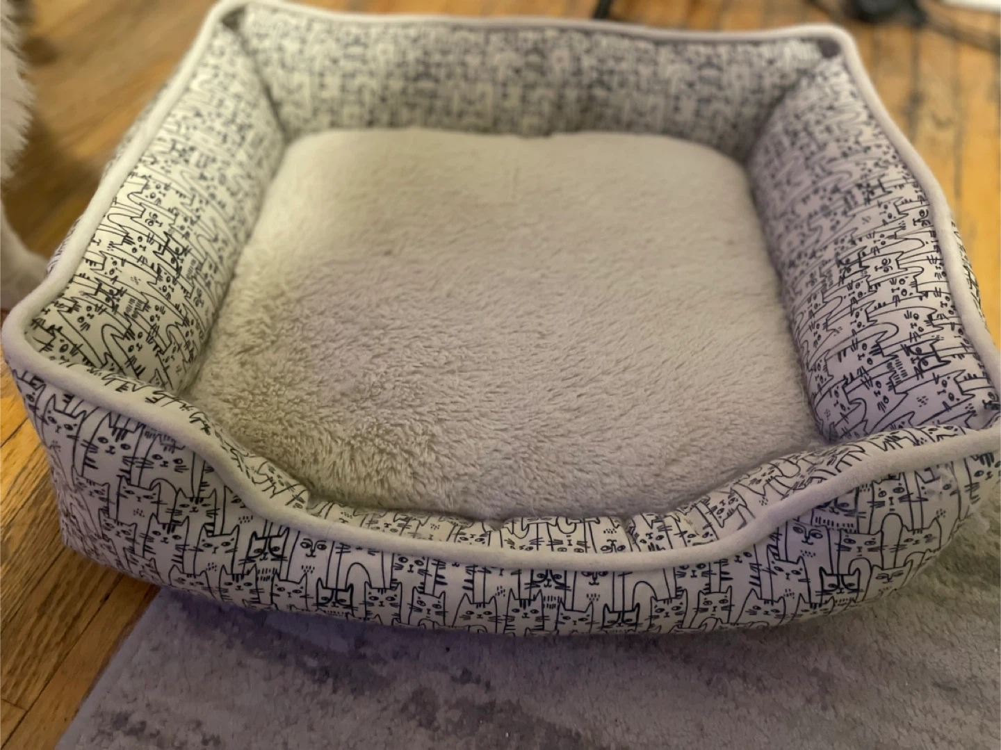 Selling a comfy pet bed with a cute cat pattern! It measures approximately 32 cm in length. The inside is a soft, plush material, perfect for your furry friend to relax in