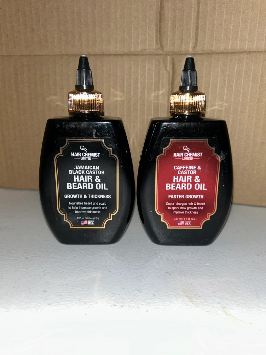 I'm selling a set of Hair Chemist hair and beard oils! You'll get one bottle of Caffeine & Castor oil for faster growth and one bottle of Jamaican Black Castor oil for growth and thickness. Each bottle contains 8 fl oz (237 ml) of product. Super-charge your hair and beard to spark new growth and improve thickness!