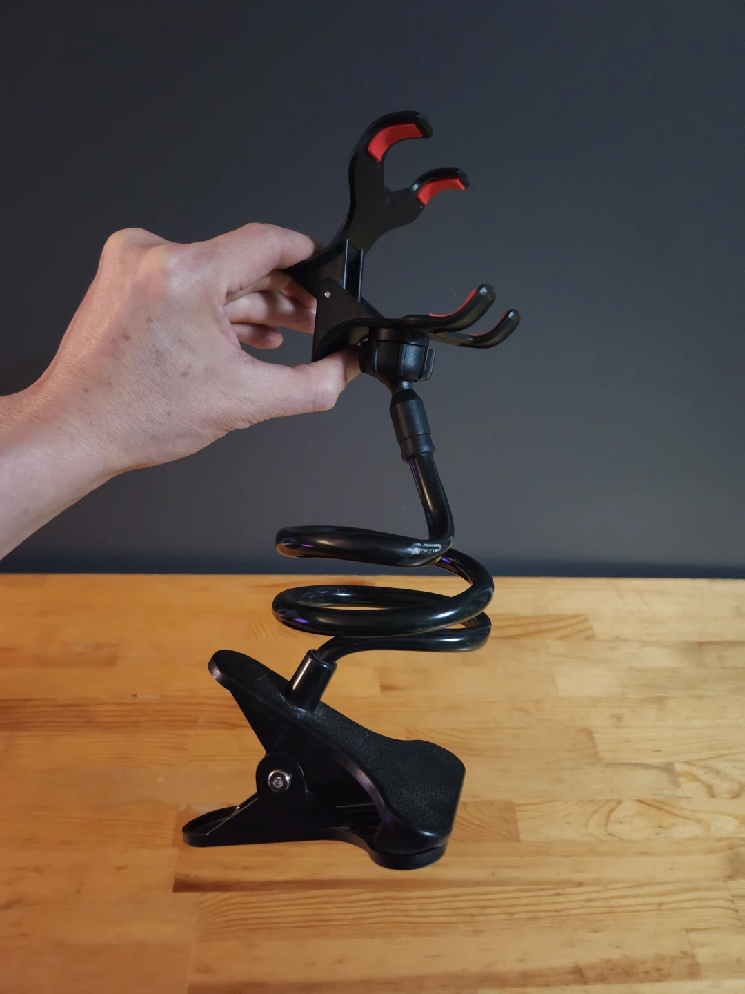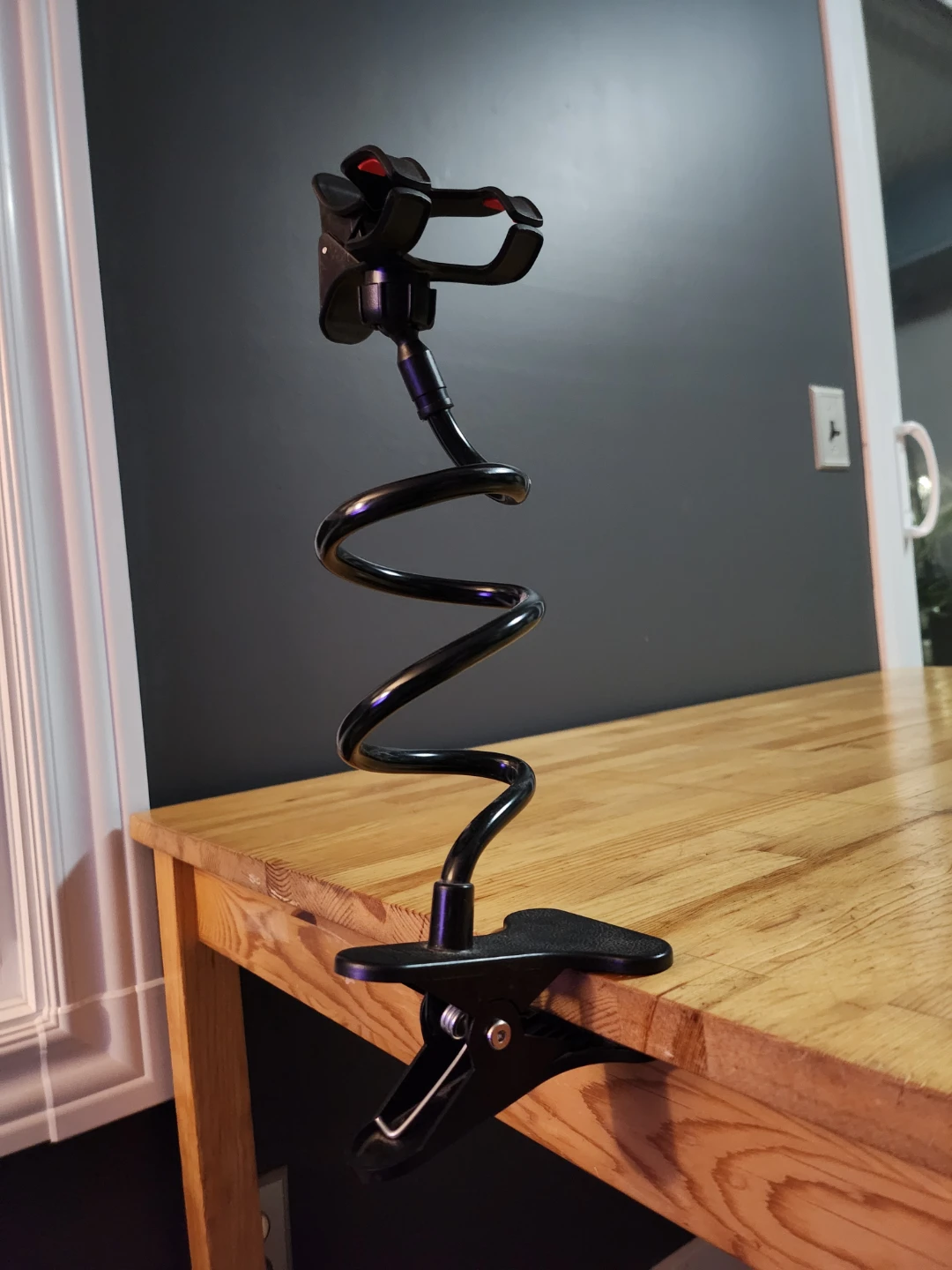 Flexible long arm phone holder. It's perfect for watching videos or video chatting hands-free. The clamp design makes it easy to attach to desks, tables, or other surfaces.
