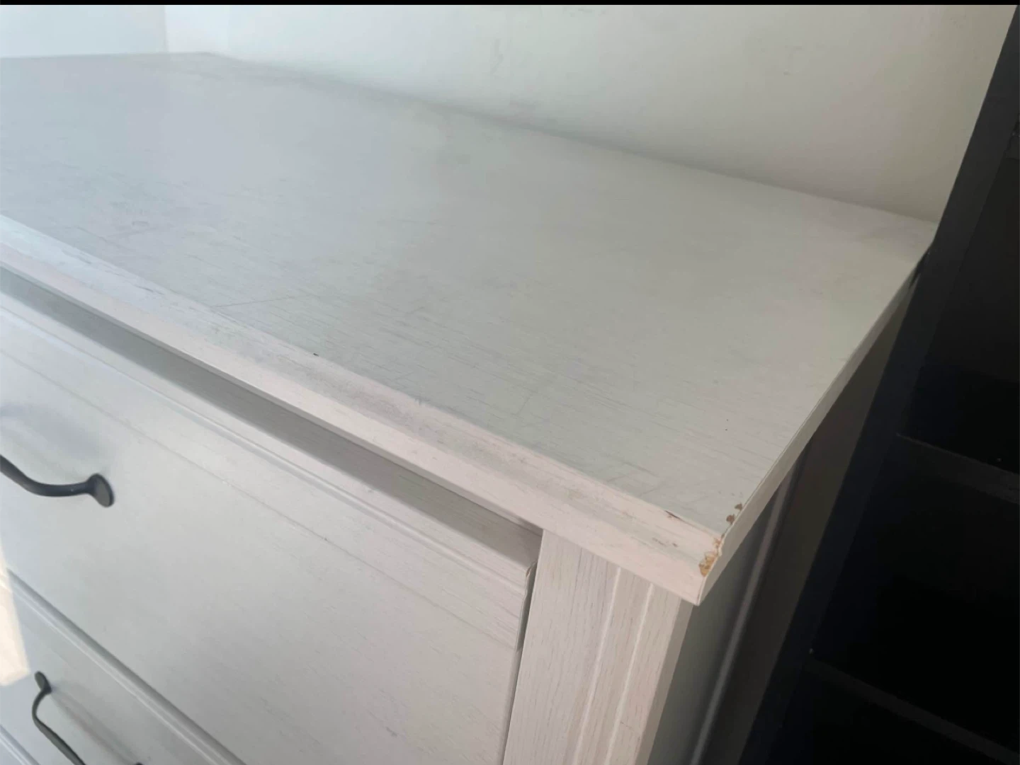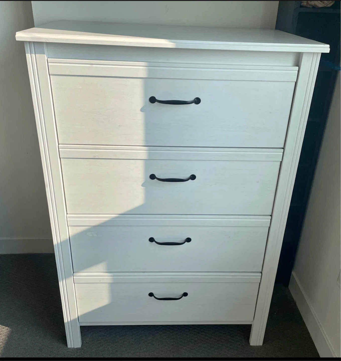 Here's a lovely white four-drawer dresser! It's perfect for adding some extra storage to any room. The dresser has a simple and clean design that will fit in with any decor. It's in great condition and ready for a new home!