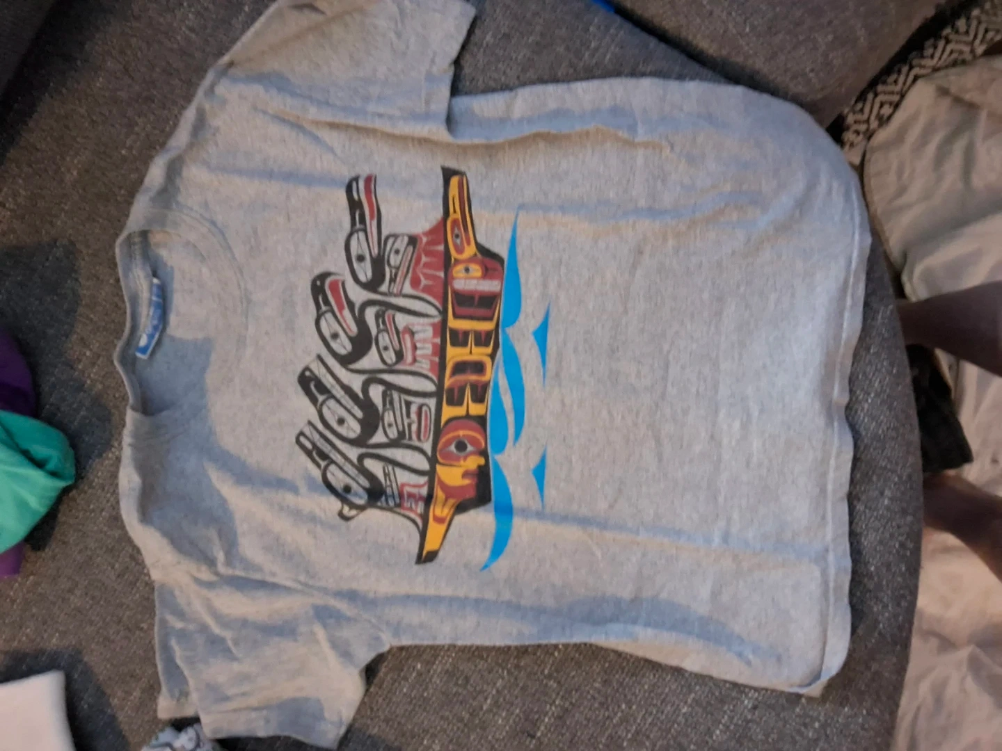 Here's a grey t-shirt featuring Northwest Coast Indigenous art! It's in great shape and ready for a new owner. A cool piece of wearable art!