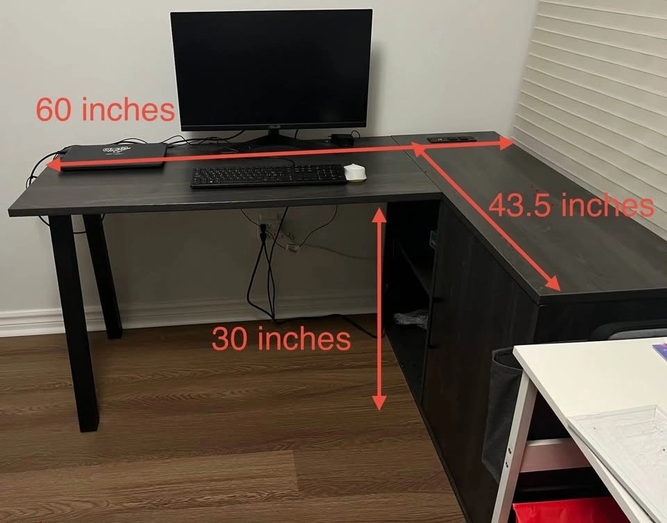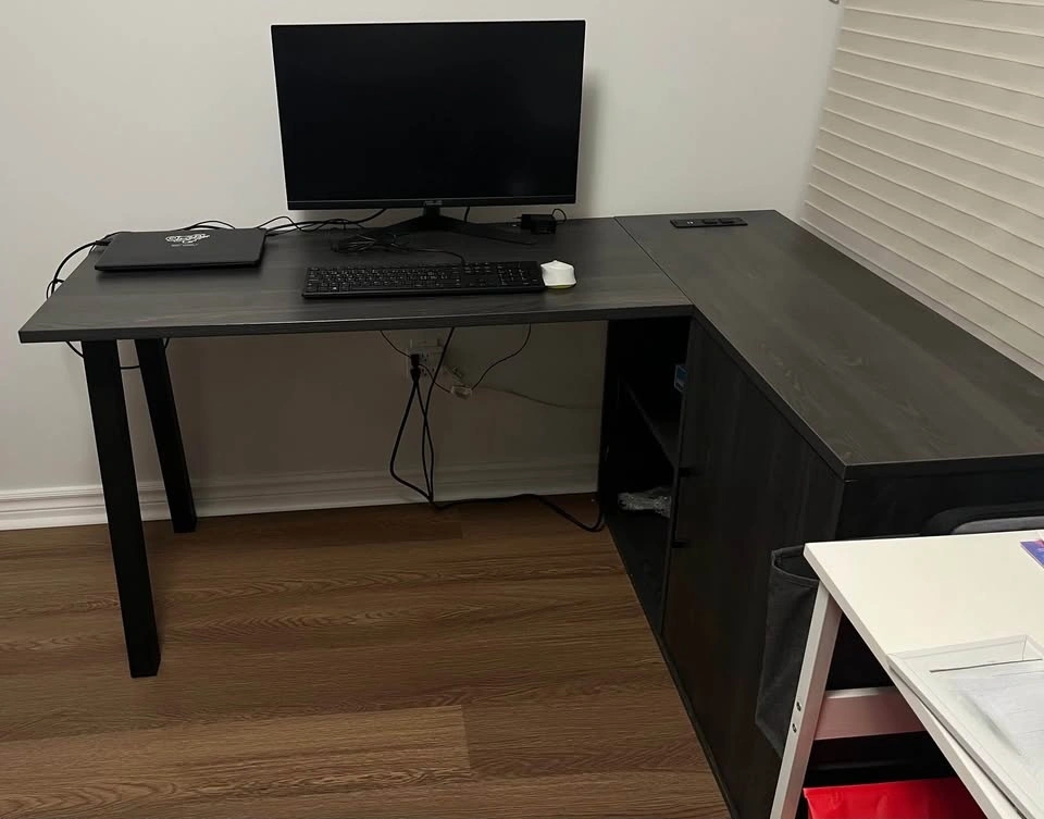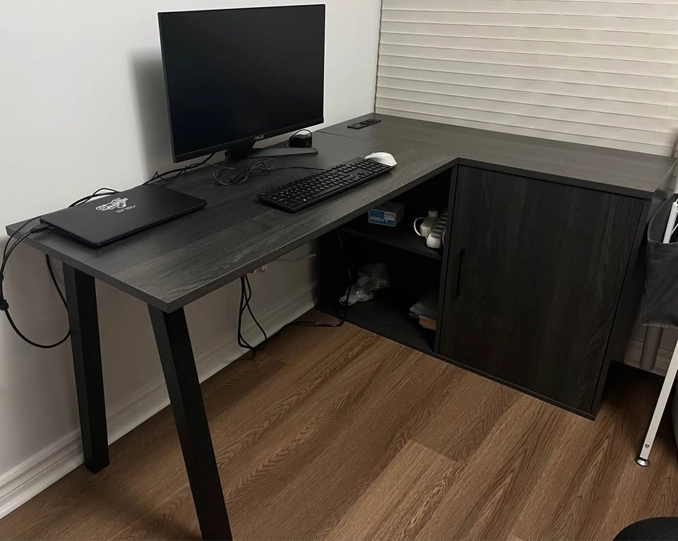 Like-new condition modern dark gray oak (almost black) L-shaped office desk. Solid, stylish, and perfect for work-from-home or gaming setup. Plenty of surface space and built-in storage.