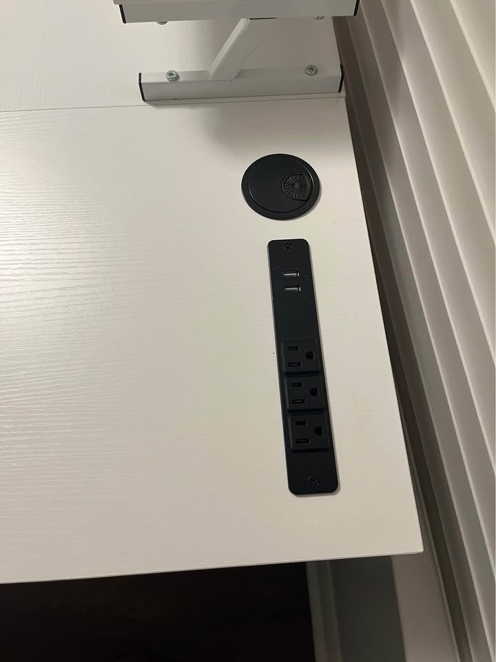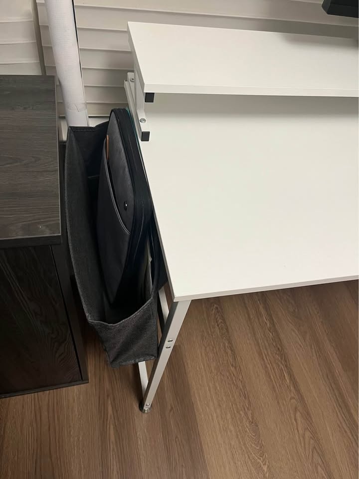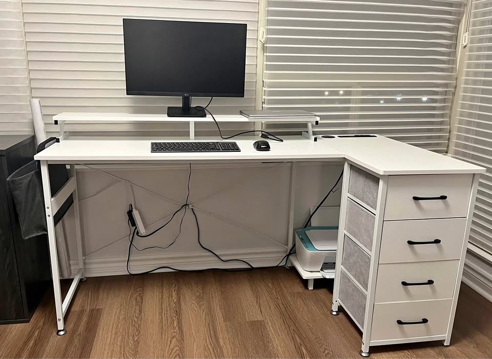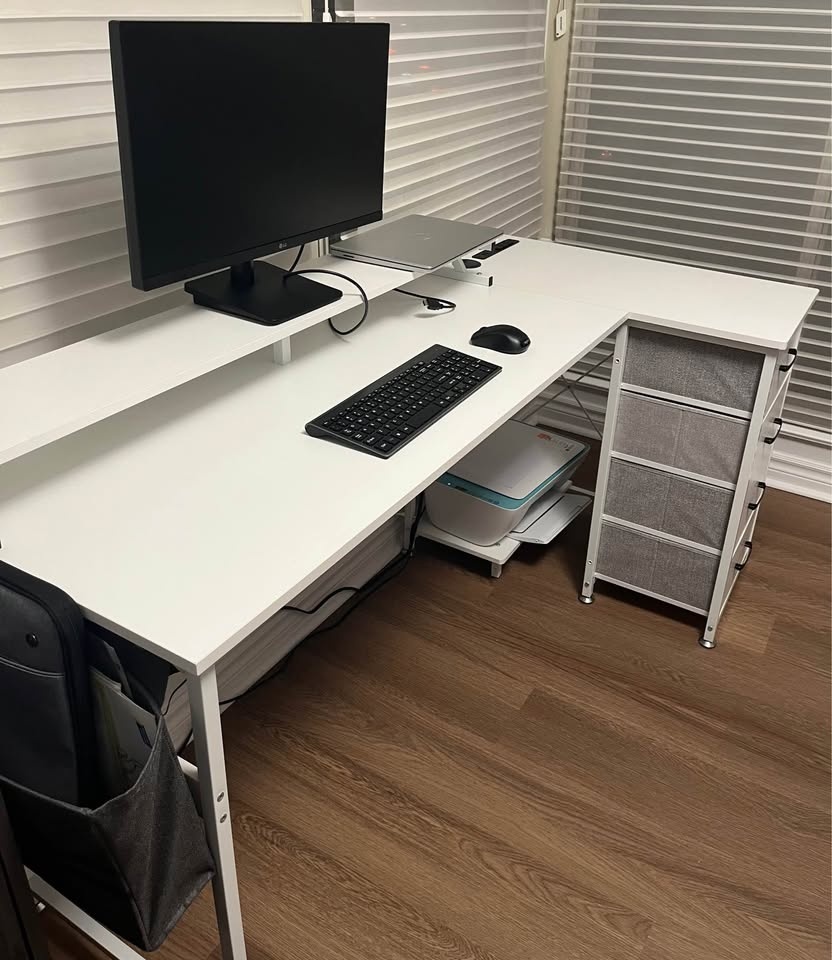 Like-new condition modern white L-shaped desk, perfect for home office or workspace setup. Clean, sturdy, and very comfortable with lots of surface area and storage.