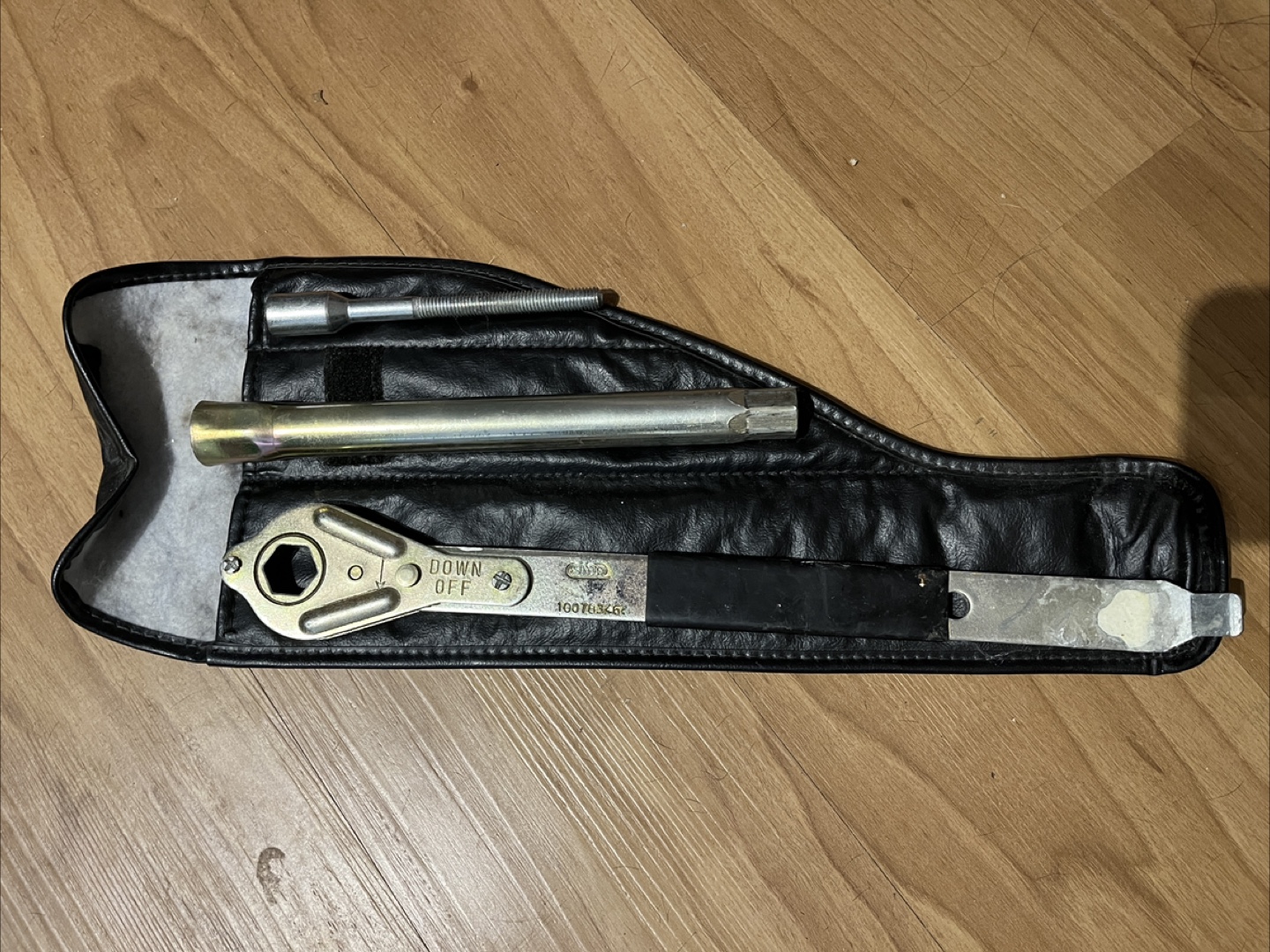 Selling a vintage lug wrench for taking wheels off a car. It includes a wrench and other tools in a leather case. Great for collectors or anyone needing a classic tool set