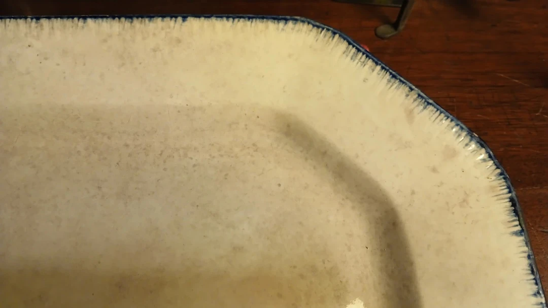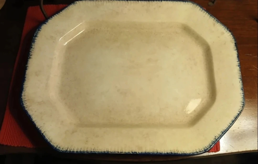 Beautiful antique blue feather edge platter, referred to as Leeds Ware and made in the mid 19th C. Generous size measures 11.25” x 14.25”. Good condition with some crazing & staining due to age. Other items not included, but might be available separately.
