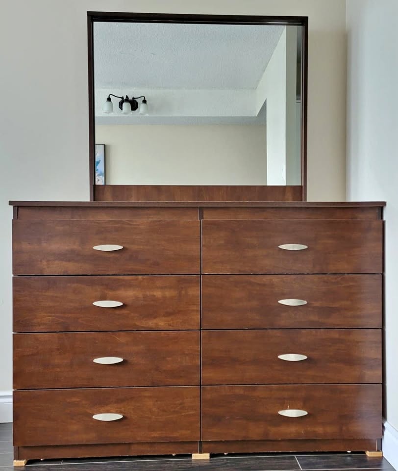 Beautiful 8-drawer wooden dresser with a large matching mirror. Sturdy, spacious, and well-maintained — perfect for bedrooms, condos, rentals, or guest suites.