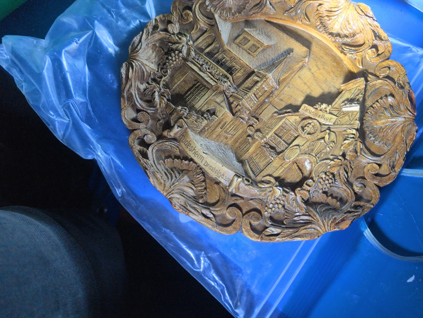Selling a vintage wooden plate featuring a scene of Rüdesheim am Rhein. It's a beautiful piece with intricate carvings and a unique design. Perfect for adding a touch of old-world charm to your home decor!