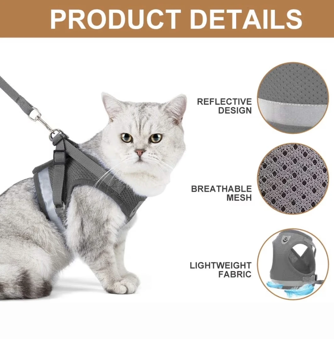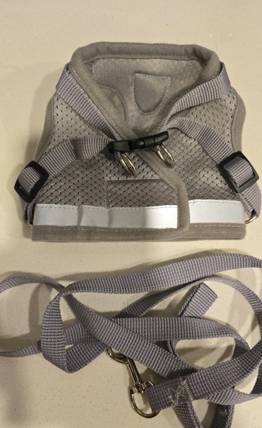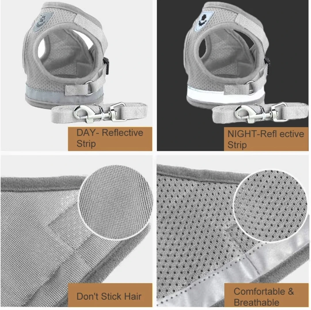 Keep your kitty, small doggo, or puppy safe and comfy with this harness and leash set! It's silver-grey and made with breathable air mesh, so it's lightweight and comfortable. The harness features reflective strips for nighttime visibility, and a safety buckle to prevent breakage. Easy to wear and adjust with a velcro design, plus it's made not to stick to hair!