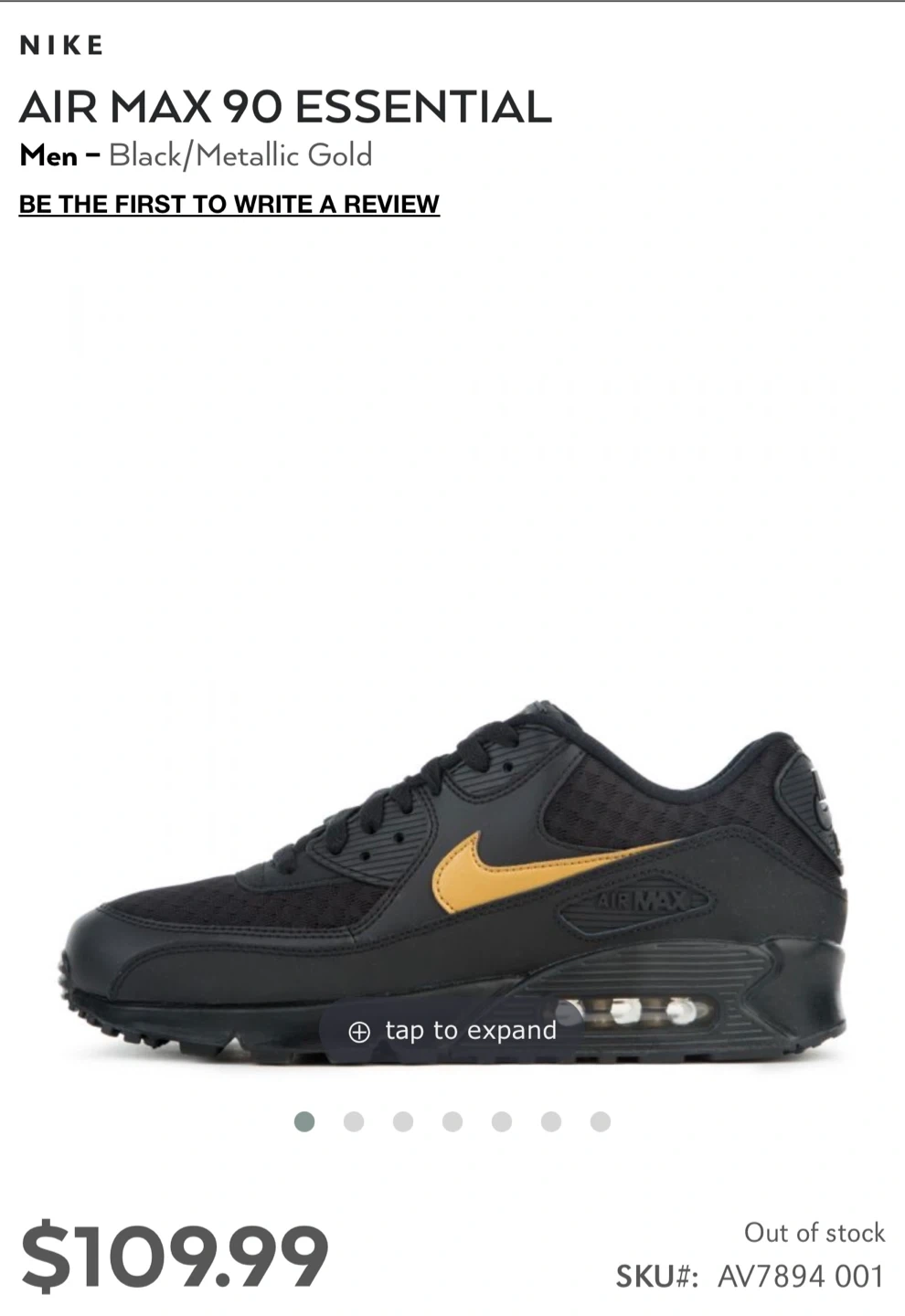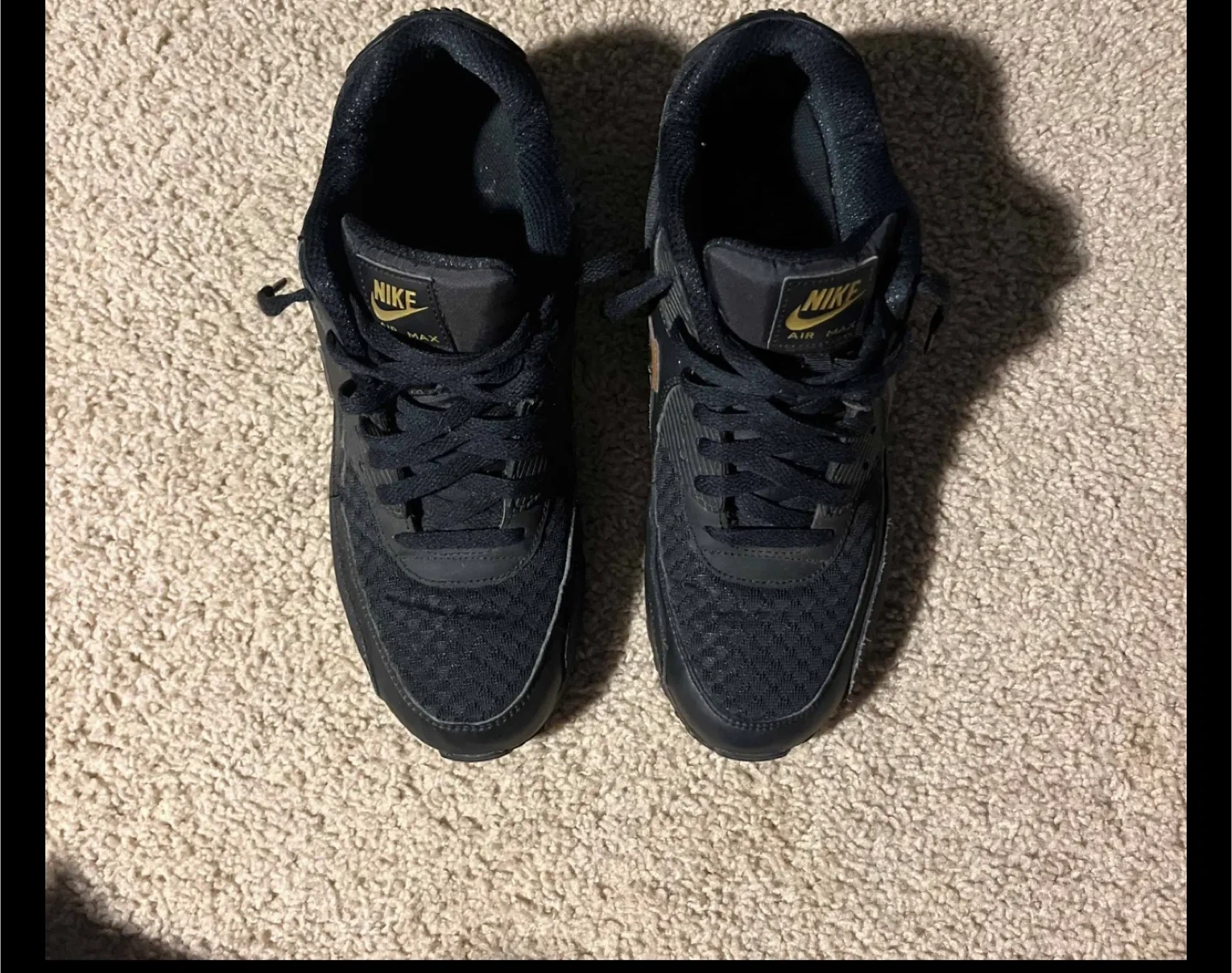 Selling a pair of Nike Air Max 90 Essential sneakers in black and metallic gold! These stylish shoes are in great condition and ready for a new owner. Perfect for adding a touch of flair to your everyday look