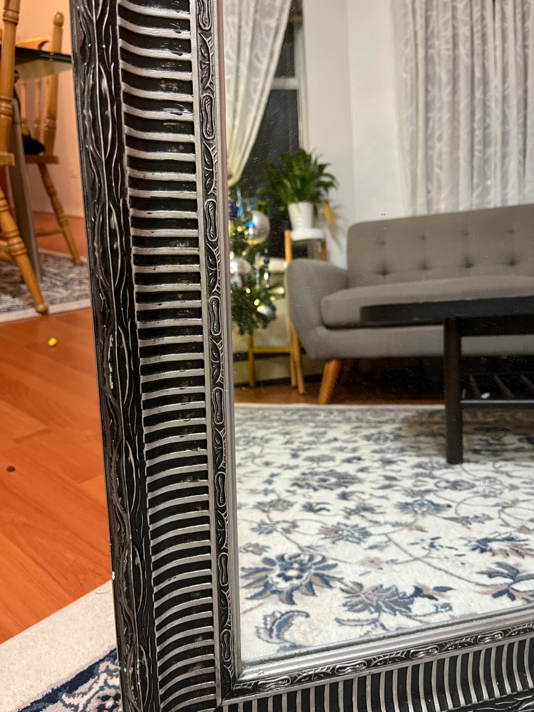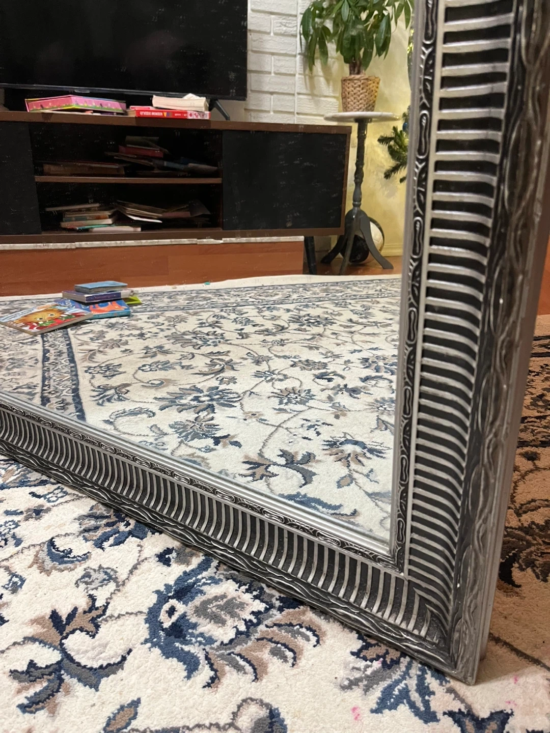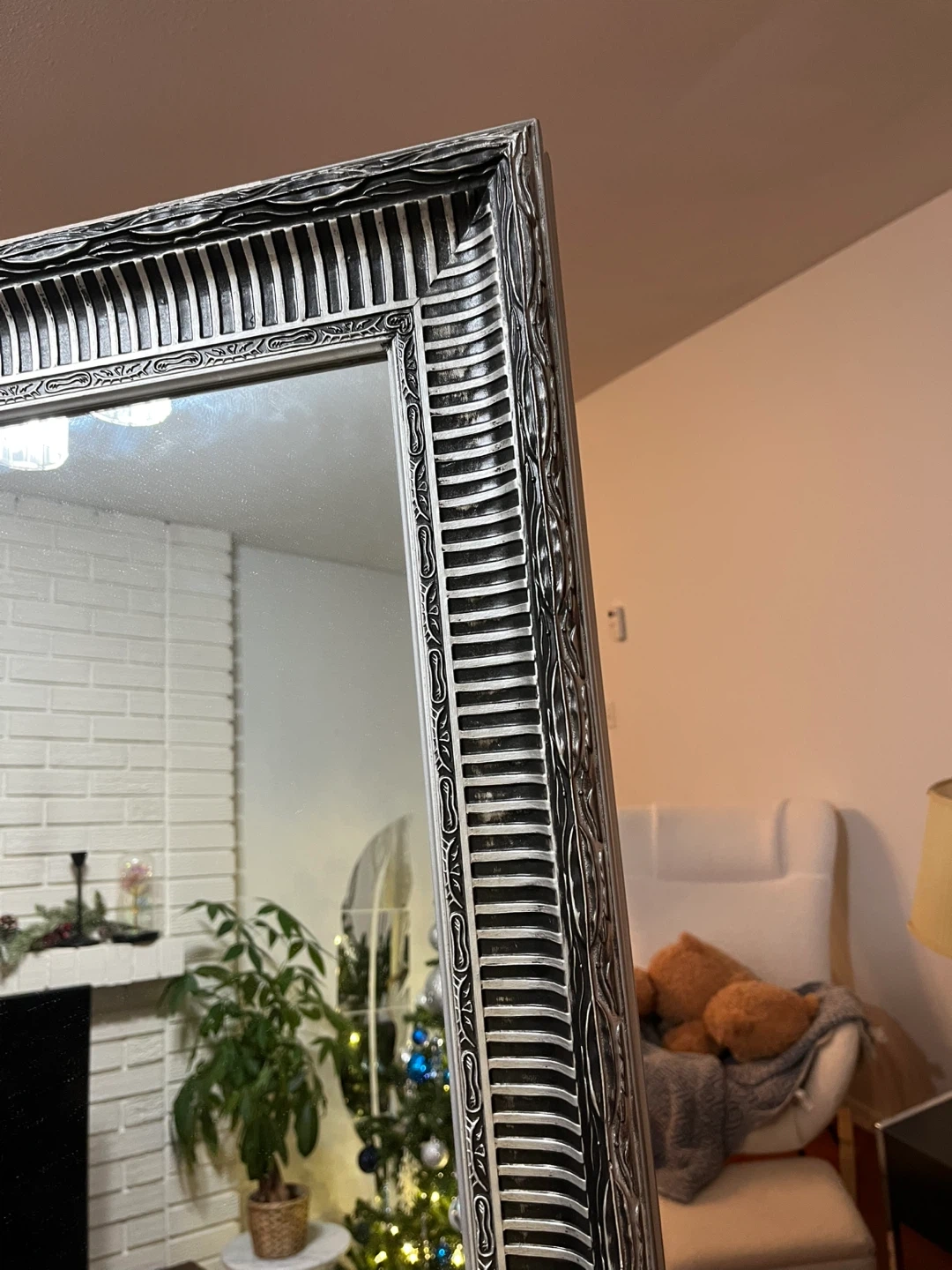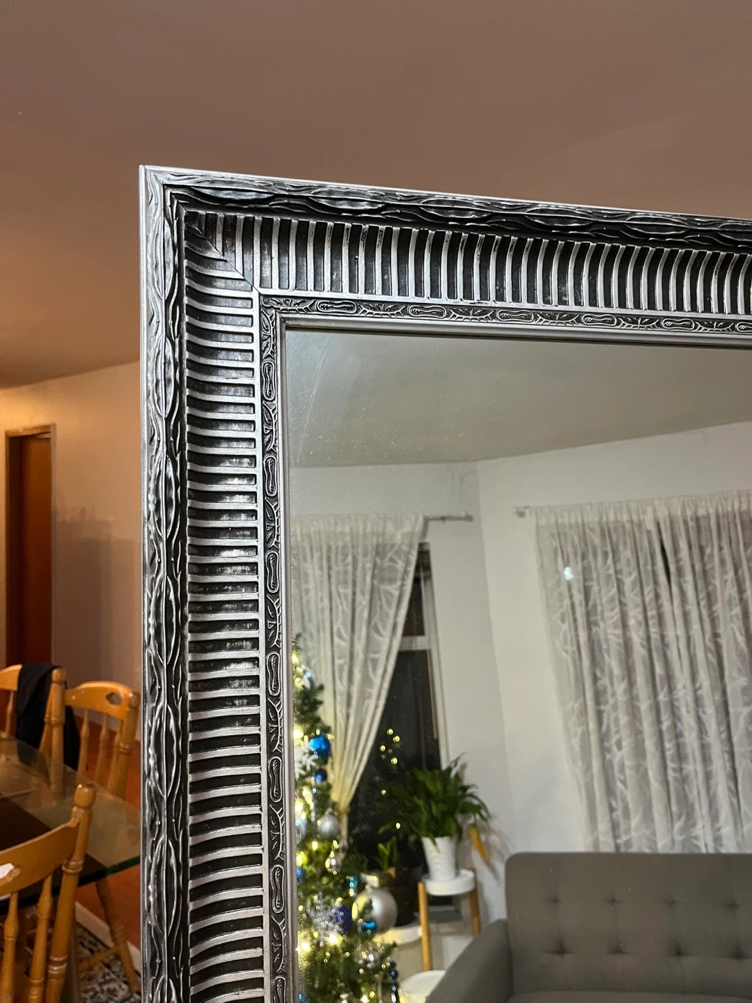 Selling a full length mirror featuring a beautiful, ornate silver frame. It's in great condition and would add a touch of elegance to any room!