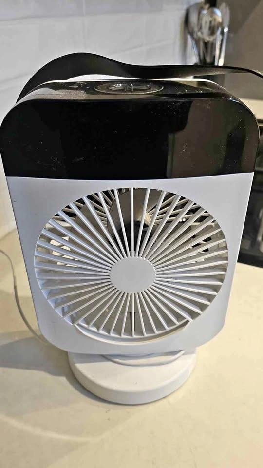 Compact black and white fan with a handle on top. Has a circular grill on the front with thin white slats. The fan is on a round white base. In good condition. Comes with remote. Fan also mists water during warmer days.