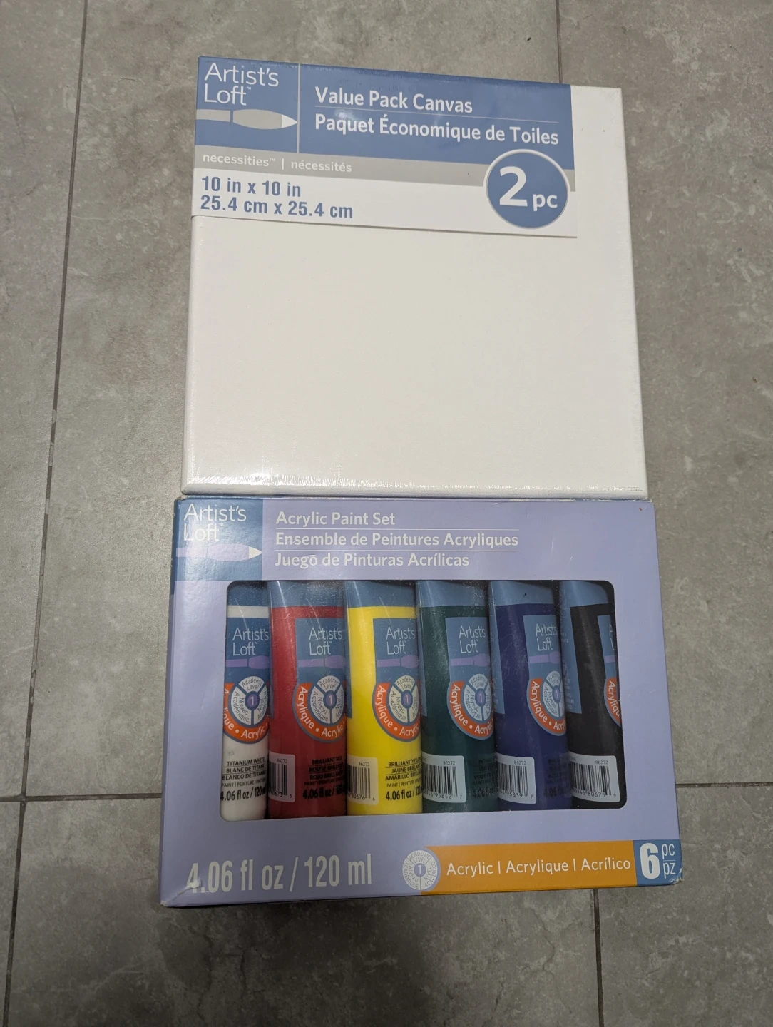Selling a set of art supplies from Artist's Loft (Michael's). This includes a 2-pack of 10x10 inch canvases and a 6-piece acrylic paint set.