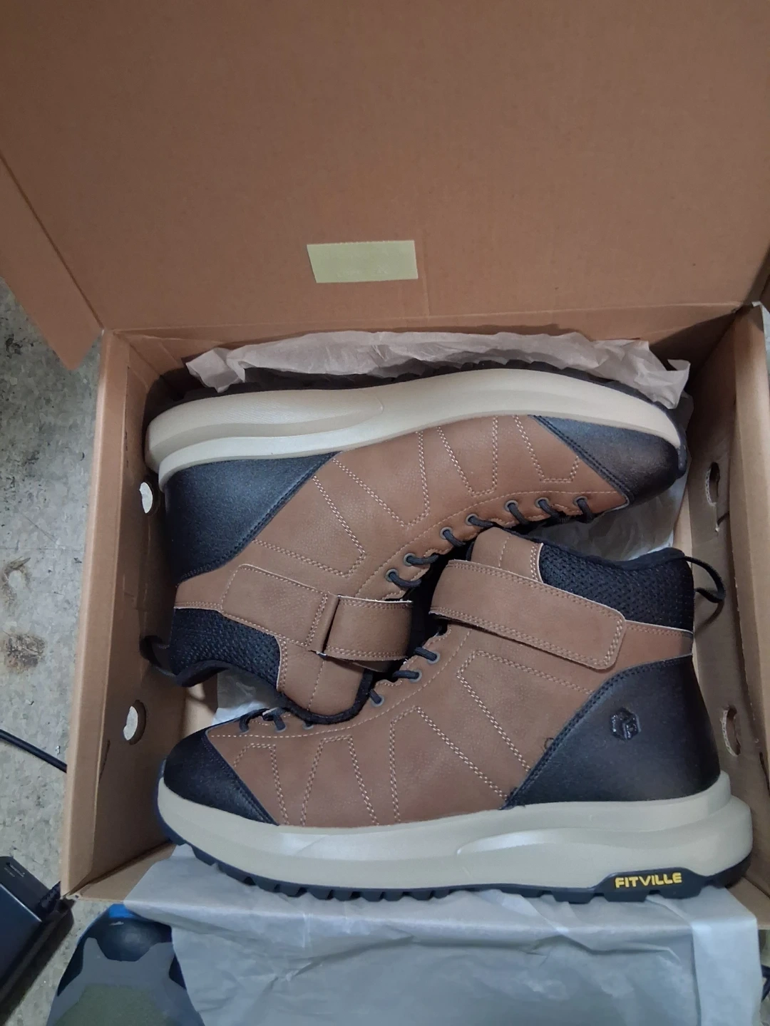 These FitVille hiking boots are in great shape and ready for your next adventure! They come in a stylish brown leather with black accents. The boots also come with their original box, so they're easy to store or gift