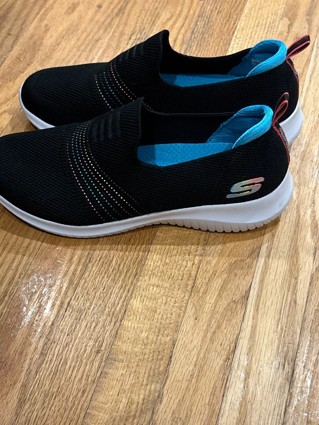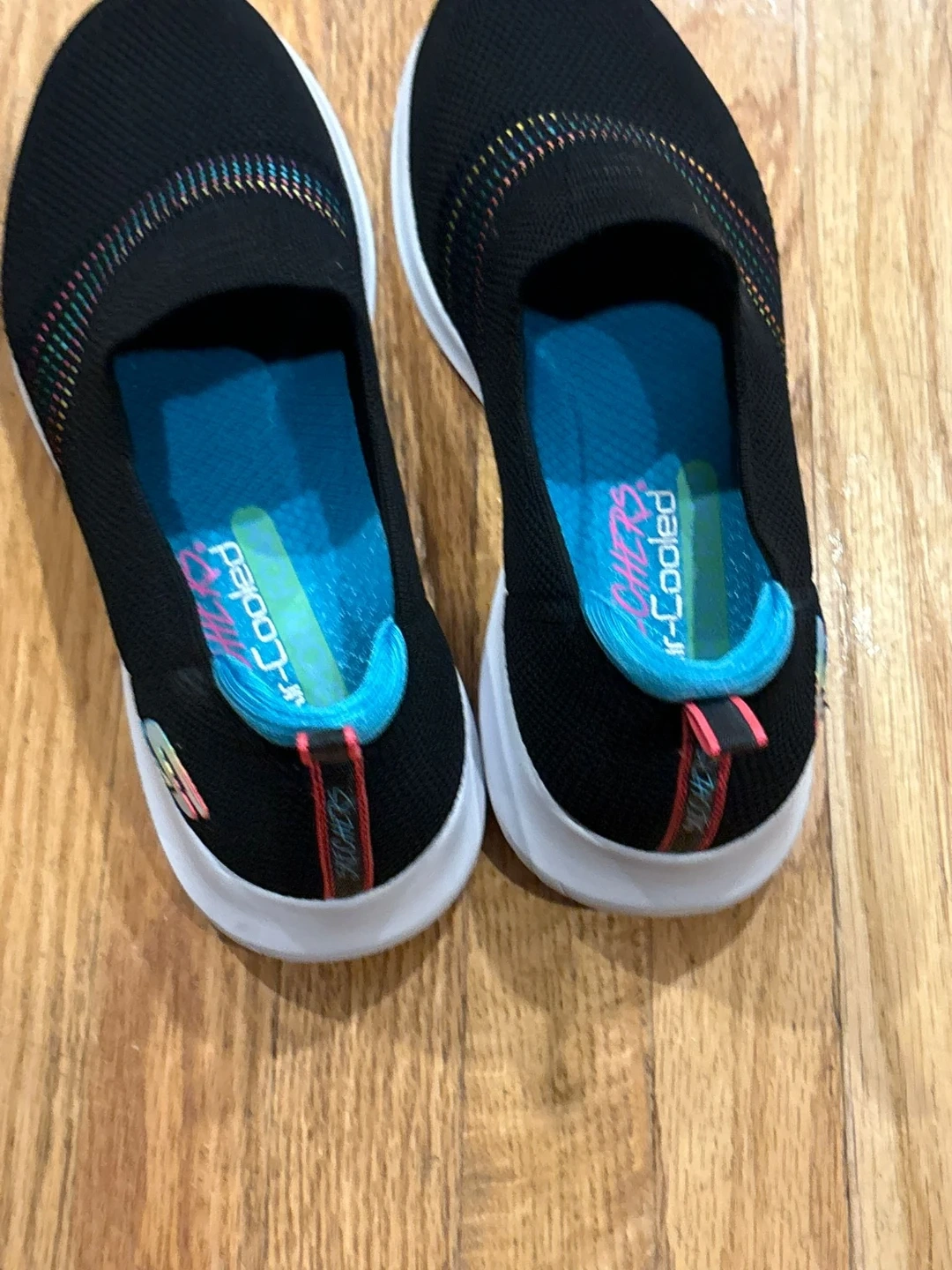 Selling a pair of Skechers Air-Cooled slip-on sneakers in black! They're in great shape and super comfy for everyday wear. The insoles are Skechers Air-Cooled for extra cushioning. Size is US 8.