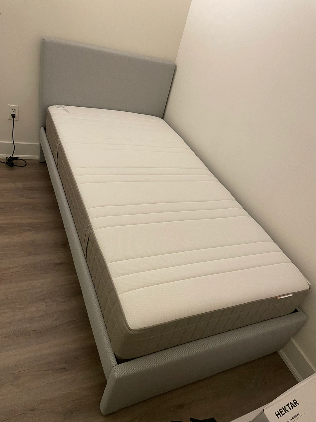IKEA GLADSTAD Upholstered bed frame and HAUGESUND Spring mattress