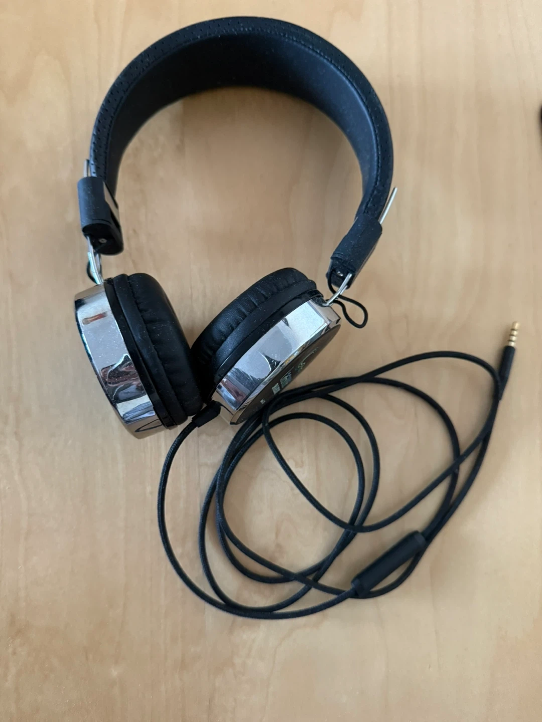 Selling a pair of black headphones with silver accents. They're in good condition and come with the attached cable. Perfect for listening to your favourite tunes!