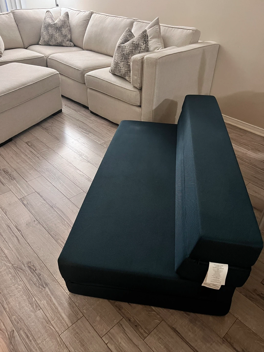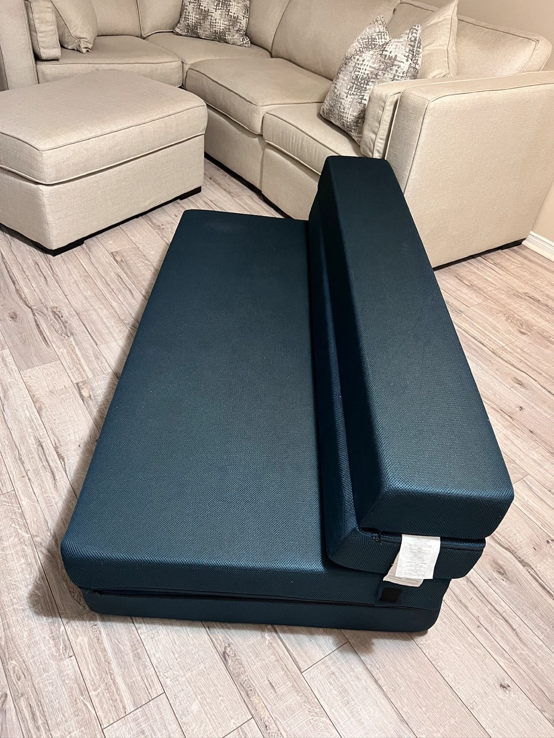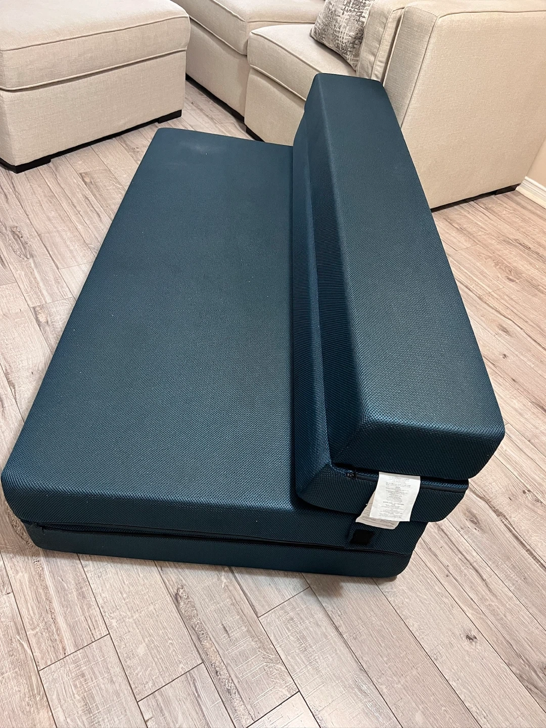 Selling a queen size foldable mattress sofa bed in a nice navy blue colour! It's in great shape. This mattress is lightweight and portable, making it easy to move around or store. No kids, no pets. It originally retailed for $ 336