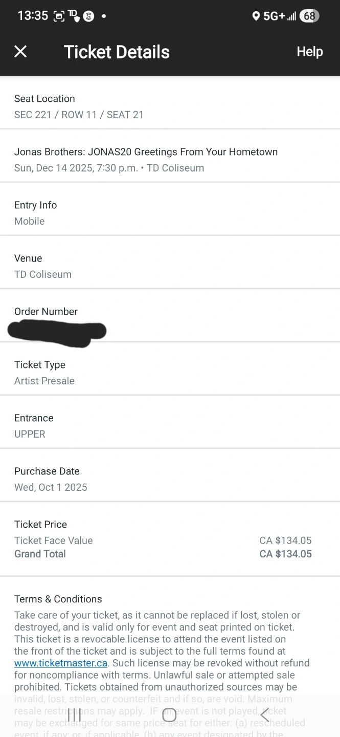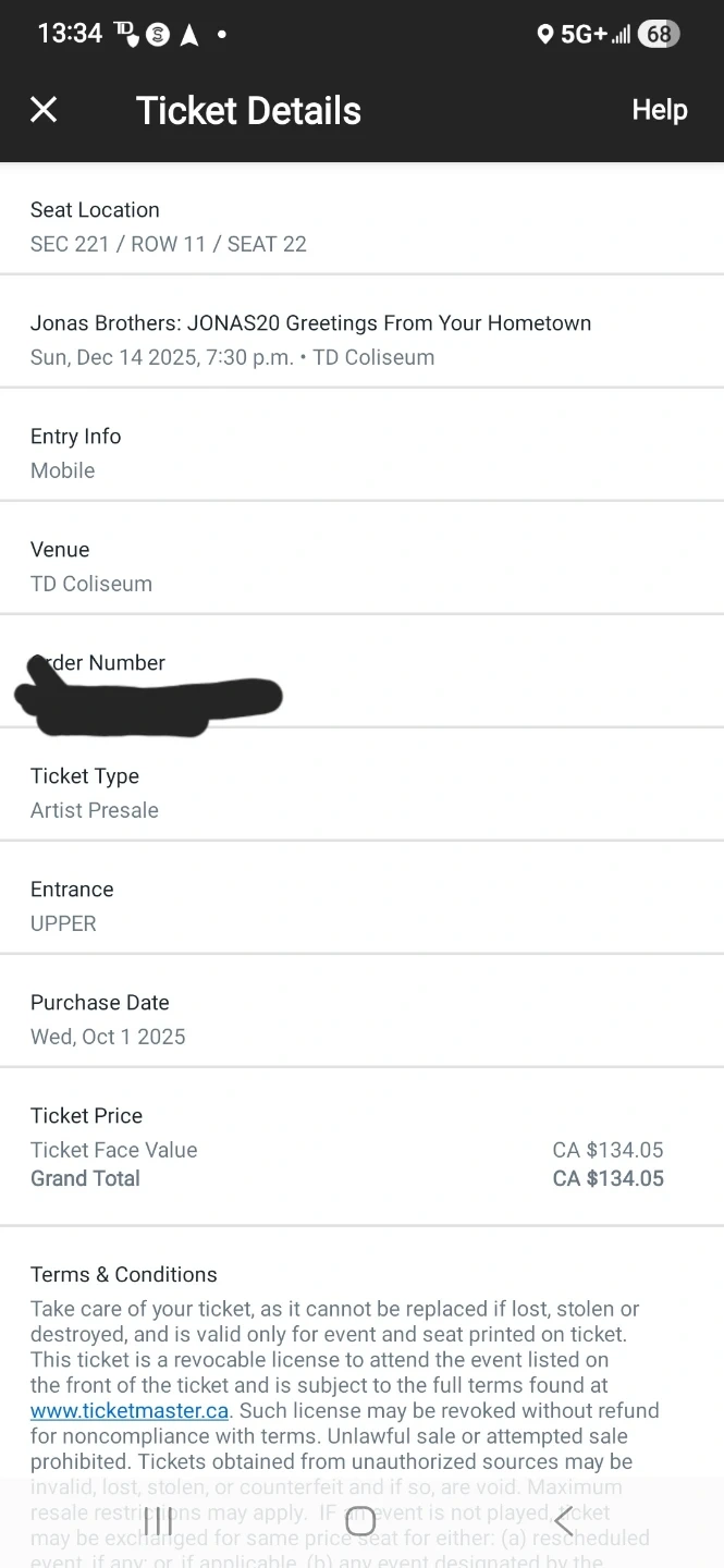 Selling two tickets to see the Jonas Brothers on December 14, 2025 at the TD Coliseum! The seat is located in SEC 221, ROW 11, SEAT 22. Ticket price face value is $134.05.