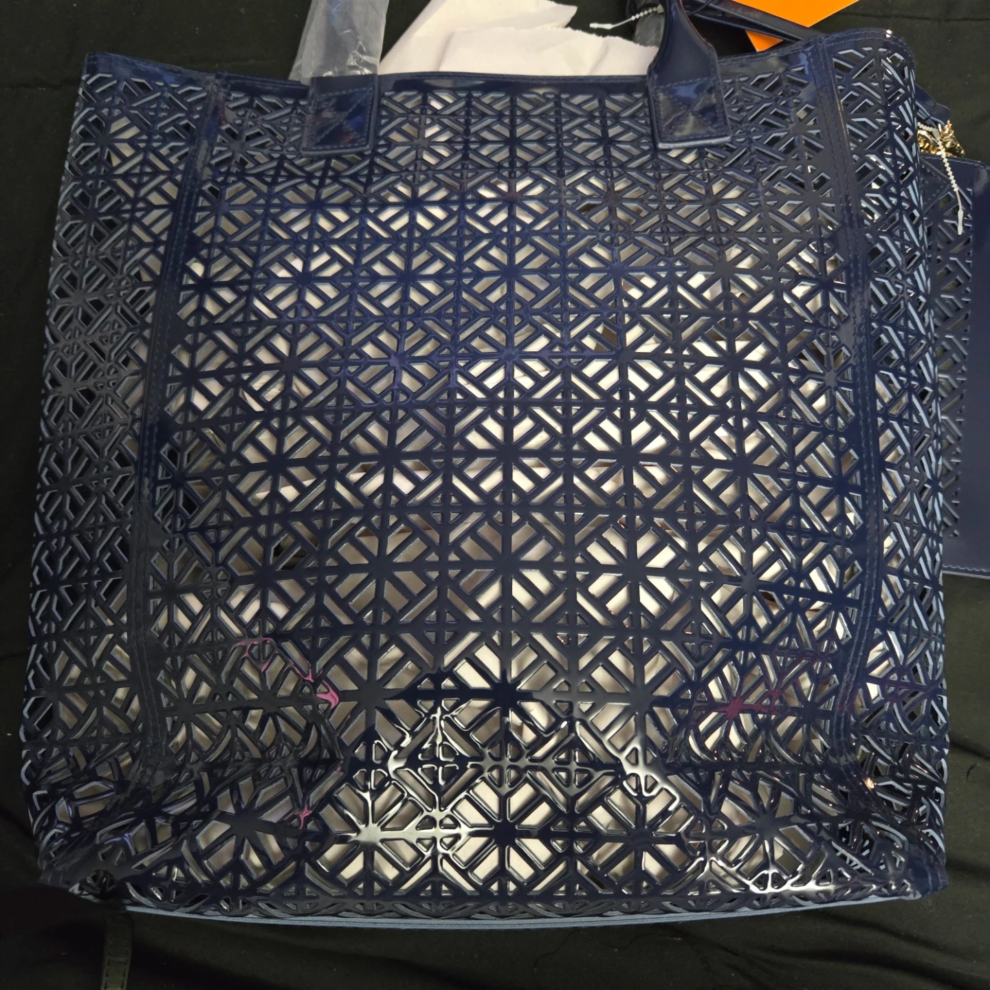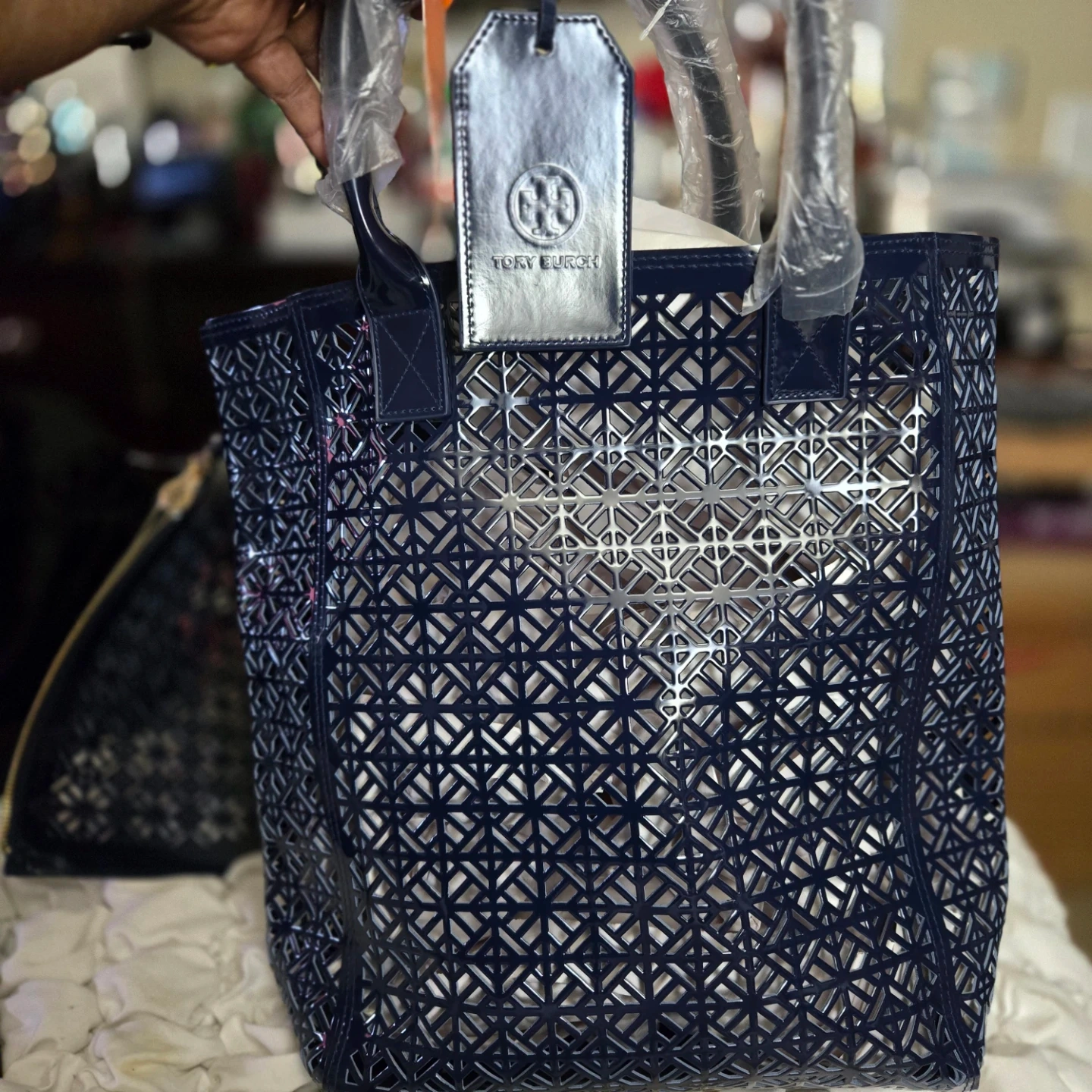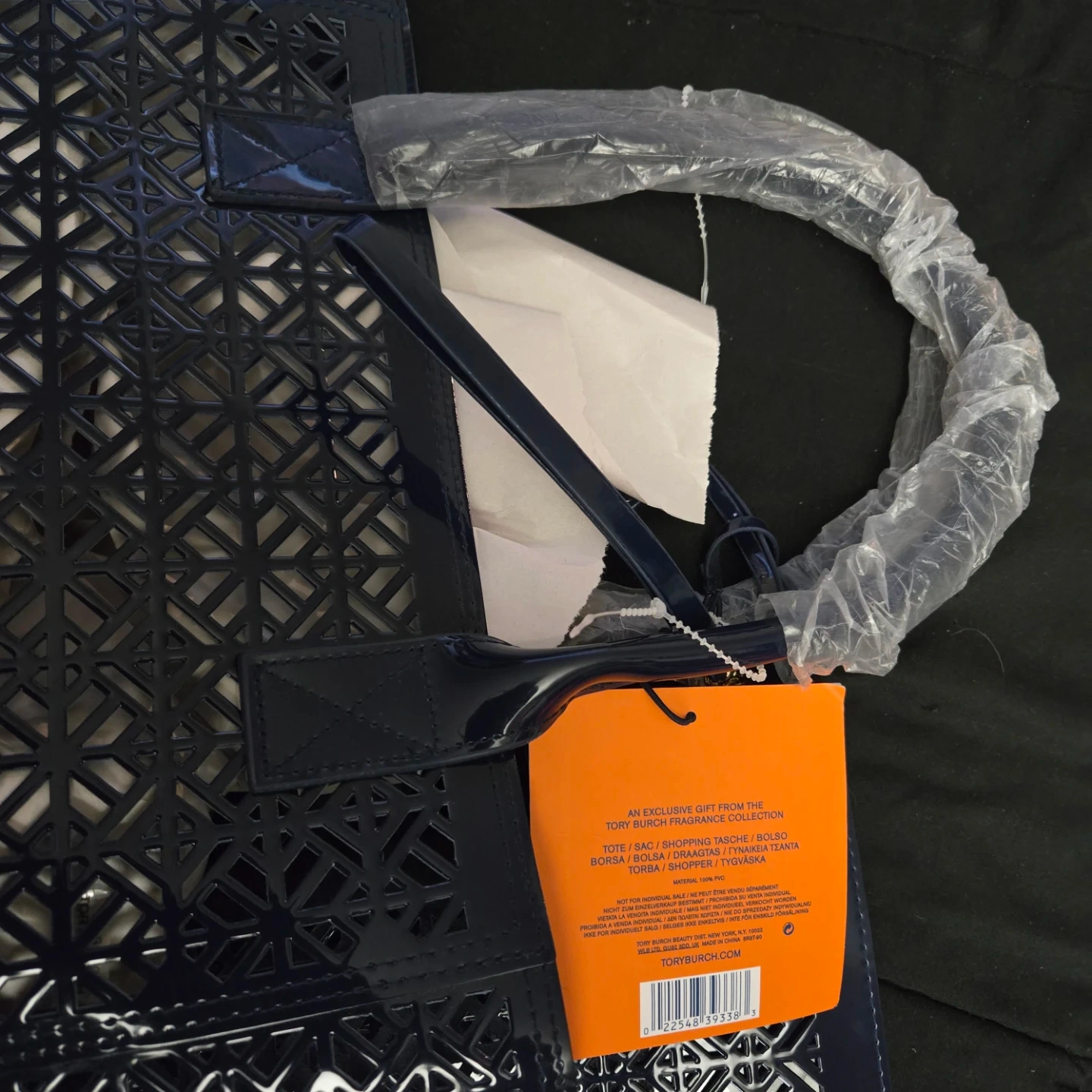 This is an exclusive gift from the Tory Burch Fragrance Collection. It's a blue tote bag and includes a matching clutch. The bag is a tote/bag/bolso/borsa/torba/shopper/tote bag
