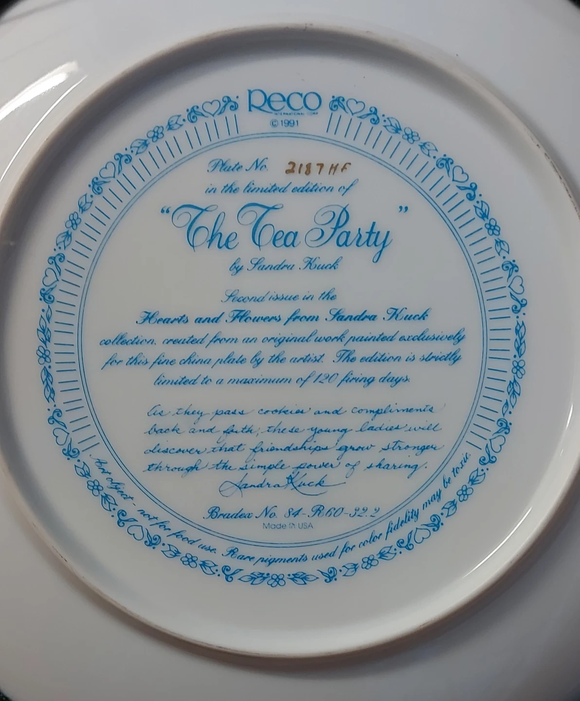 Selling a lovely decorative plate titled 'The Tea Party' by Sandra Kuck. This is the second issue in the Hearts and Flowers collection. It's a limited edition plate from Reco. The frame is made in Canada by St. Marys Wood Products. The plate number is 2187 HF. Pick up only Pet free and smoke free household Yonge and Eglinton area Only cash payment