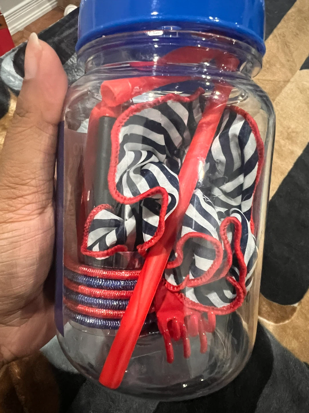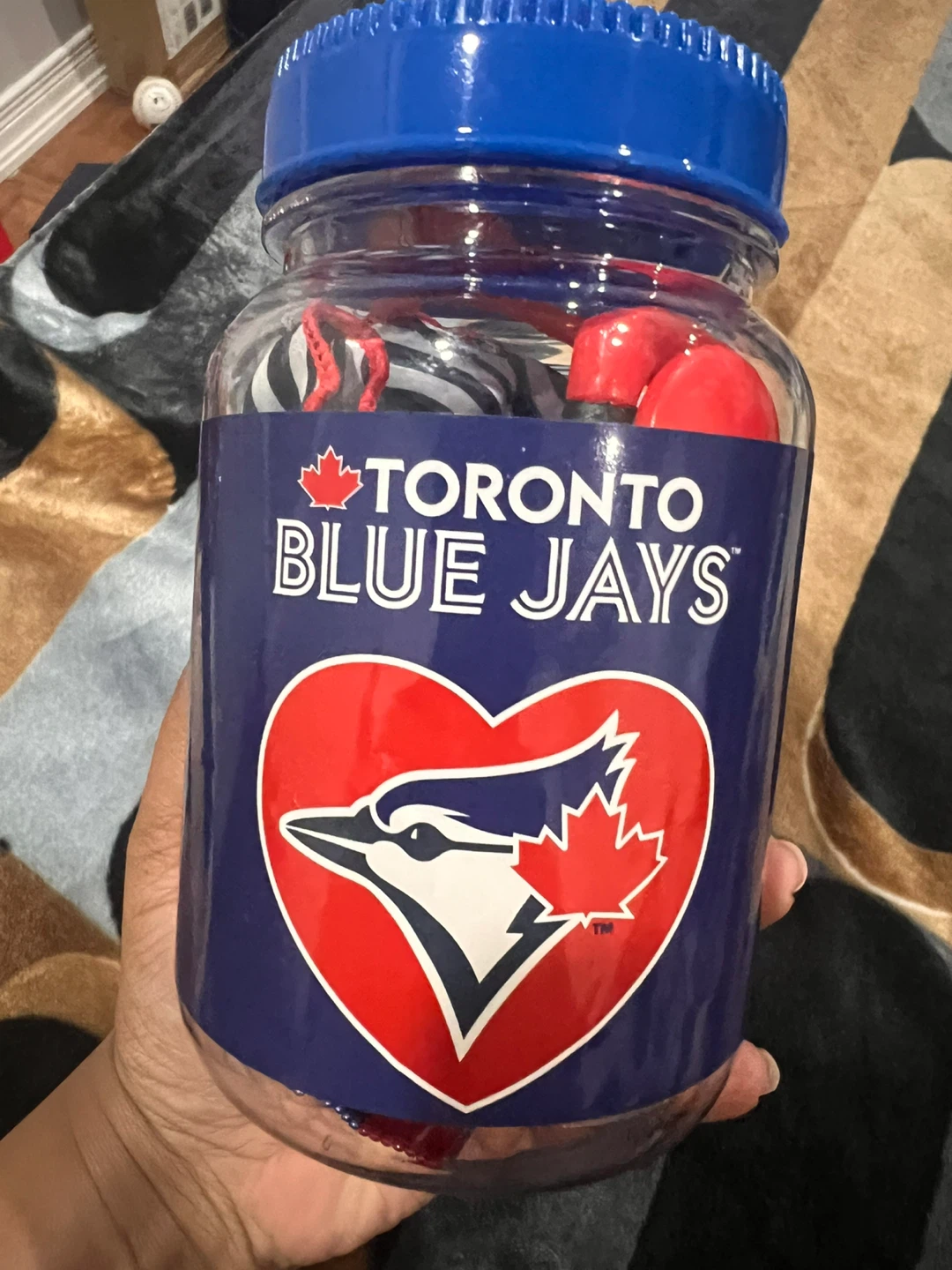 Selling a Toronto Blue Jays jar filled with various accessories. It features the iconic Blue Jays logo with a maple leaf. Perfect for any Blue Jays fan!