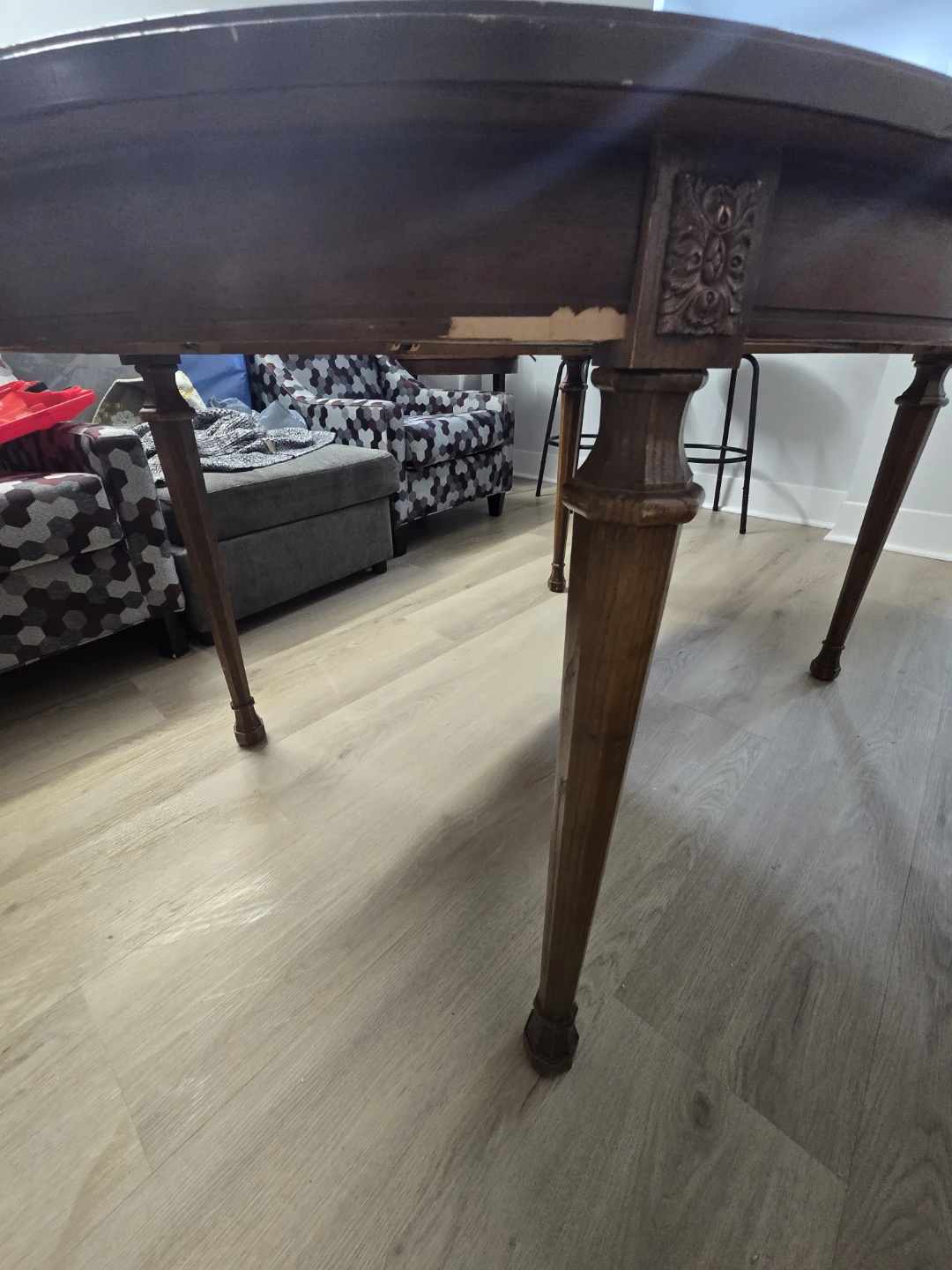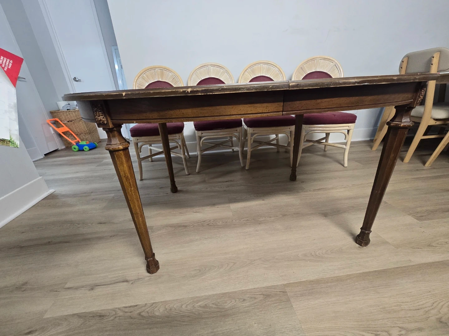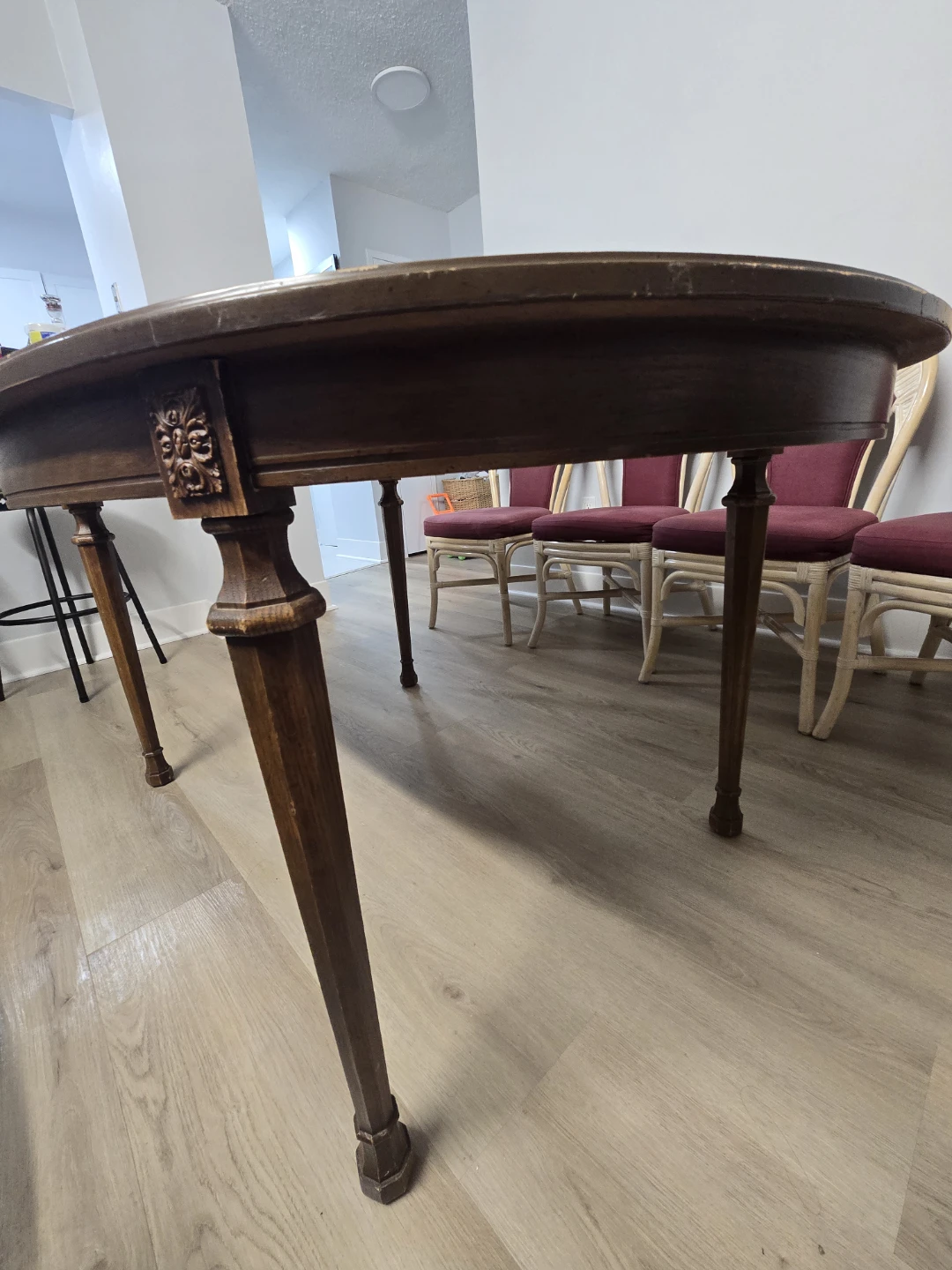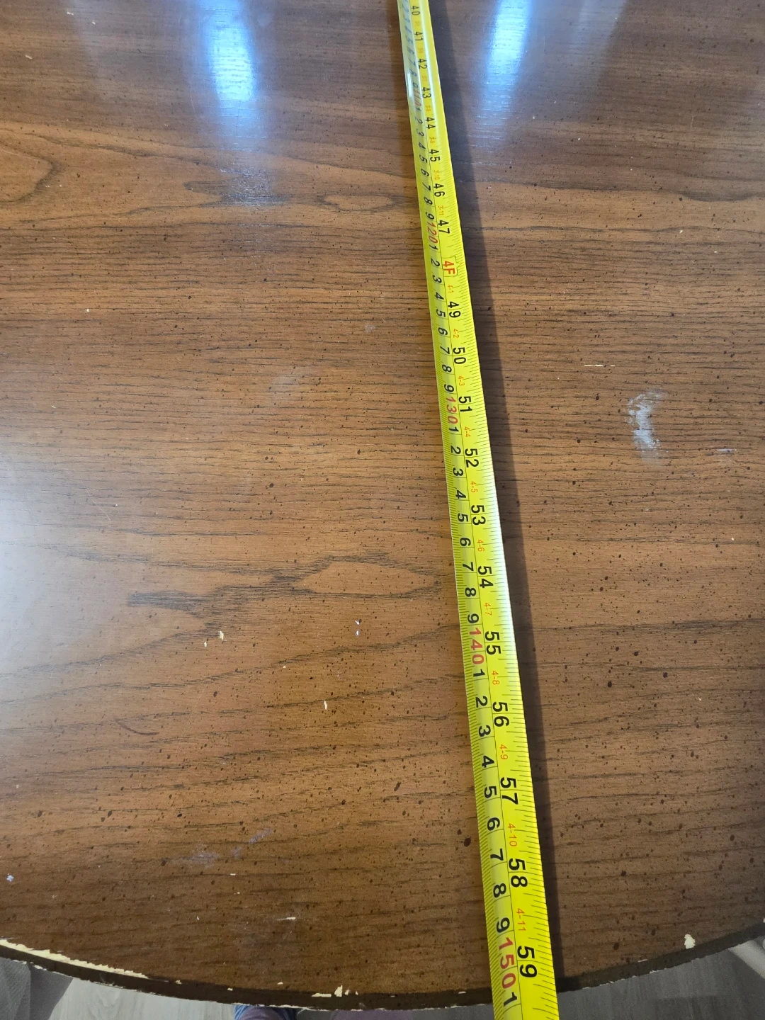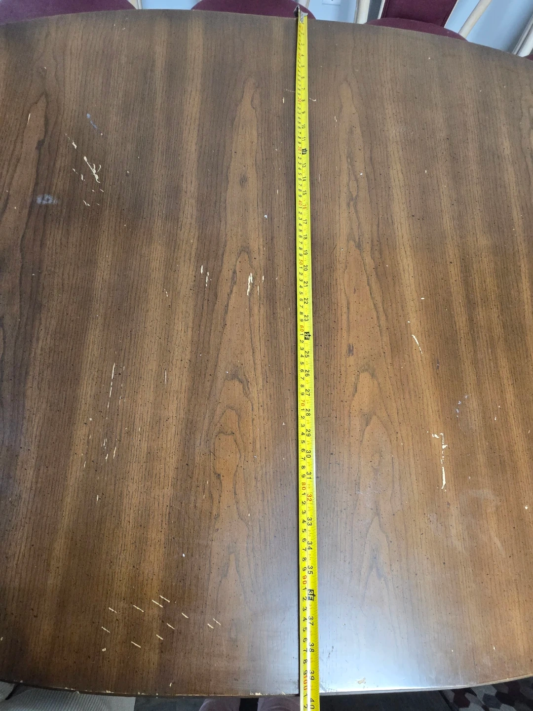 We are selling a pre-owned oval vintage wooden dining table for sale. It measures approximately 59 inches in length and 41 inches in width. Please note that there are some minor surface scratches.