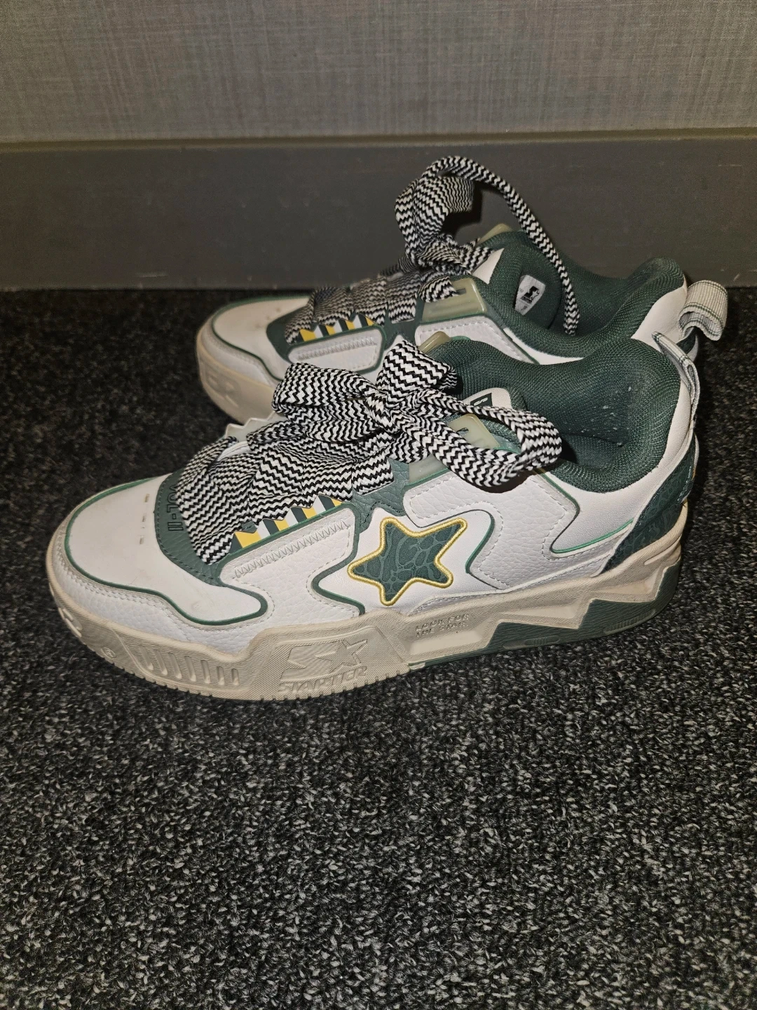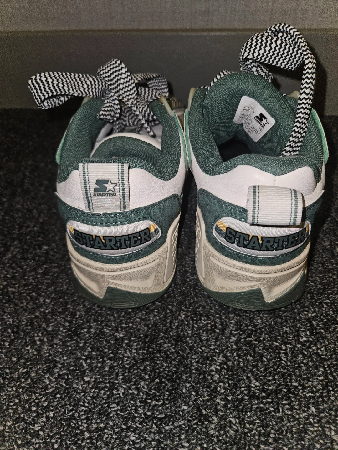 Selling a pair of Starter Vol-II sneakers in white and green! They are size 8 and have a unique black and white checkered pattern on the laces. The shoes feature the Starter logo with a star on the side and the brand name on the back. They're in great condition and ready for a new owner!
