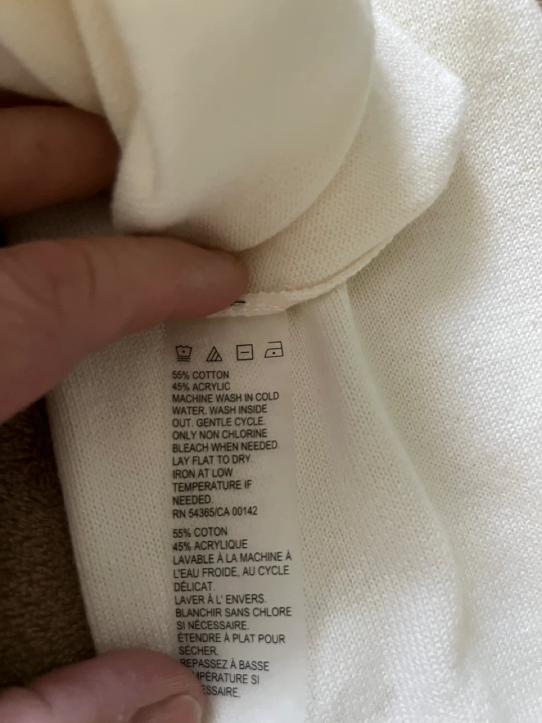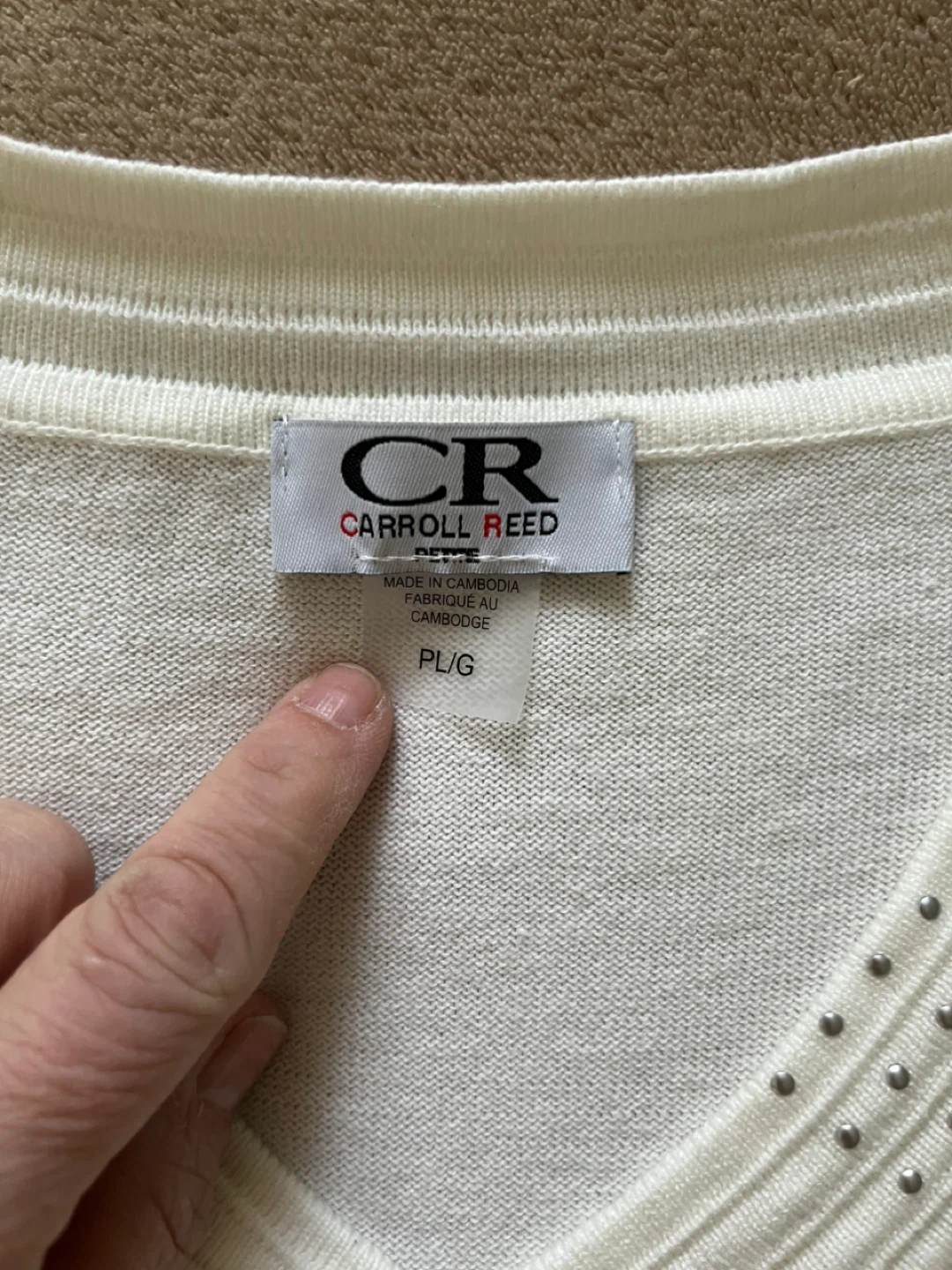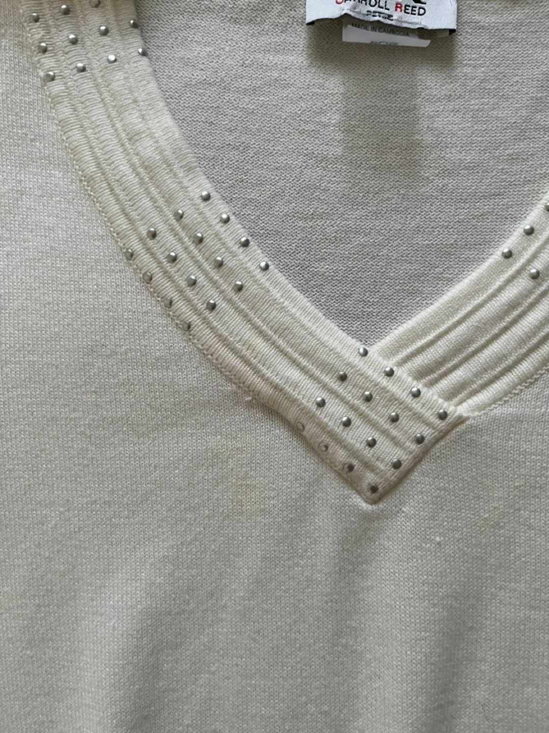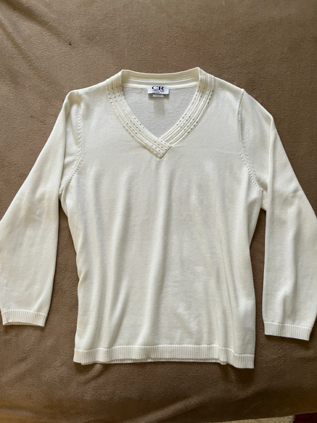 Here's a lovely Carroll Reed sweater in a creamy ivory colour! It features a V-neck design with subtle embellishments. The size is PL/G (Petite Large/Grande).