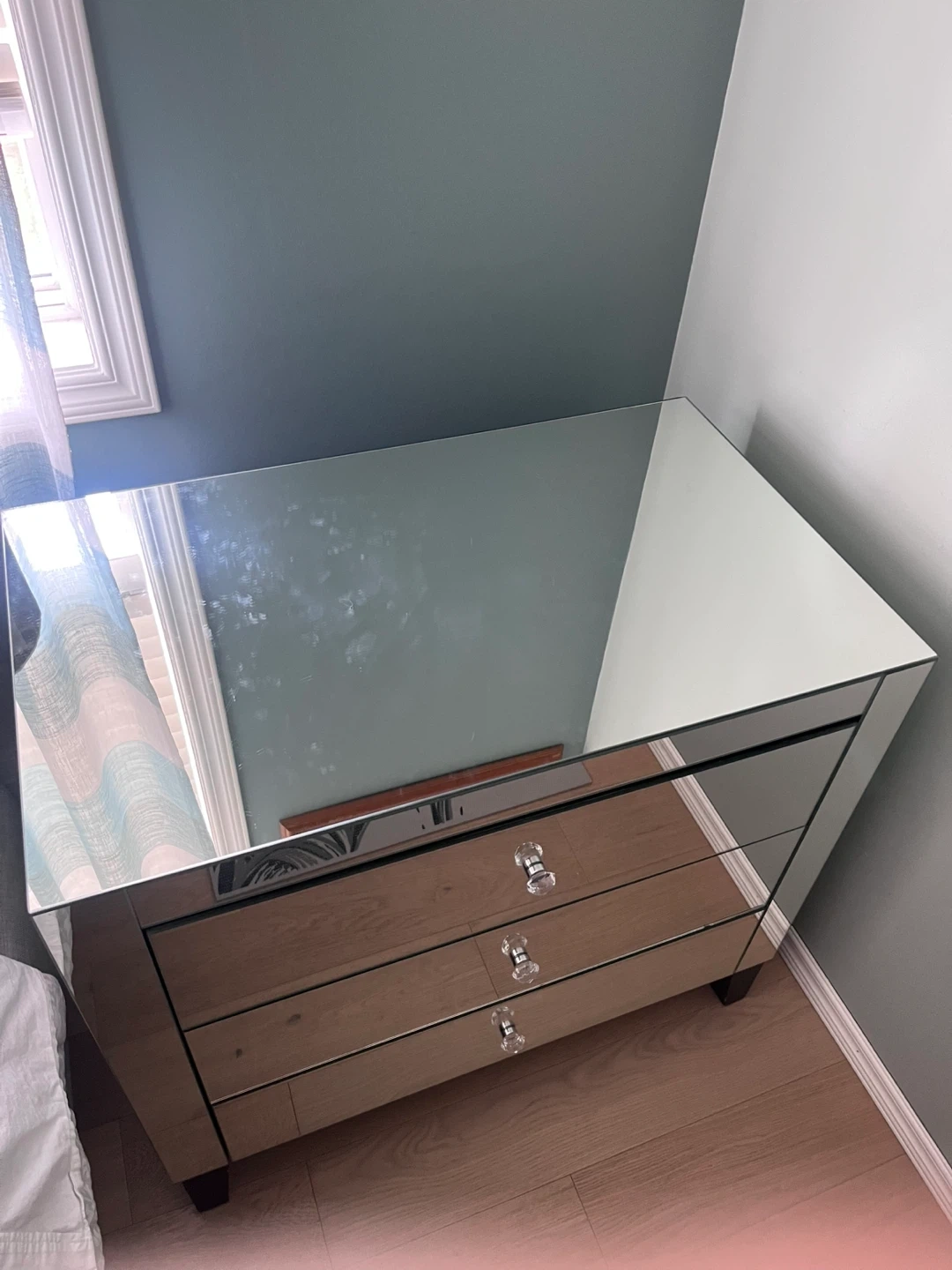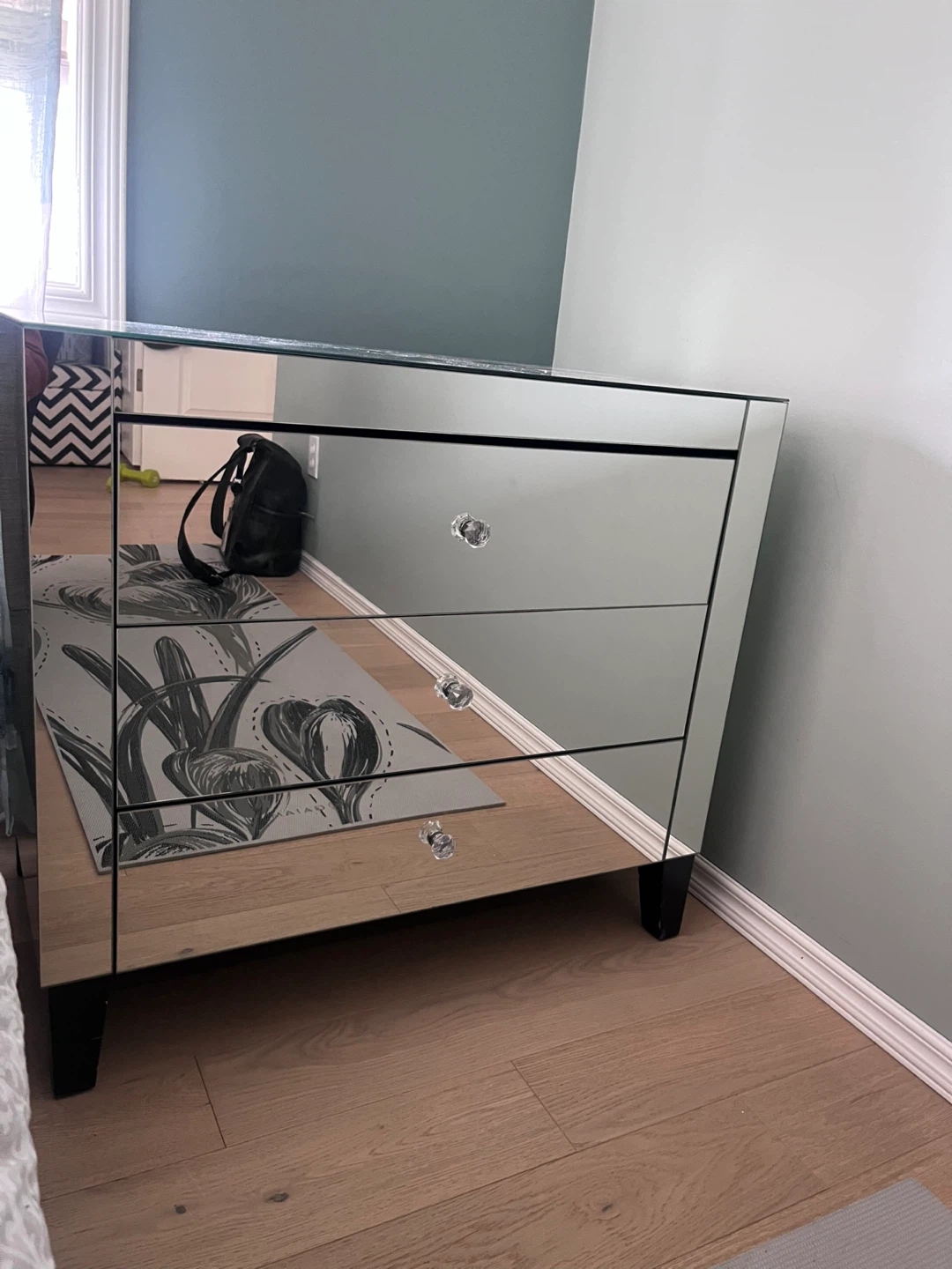 Selling a mirrored 3-drawer dresser! It's in great condition and would add a touch of glam to any room. The drawers provide ample storage space. It's a stylish and functional piece of furniture!